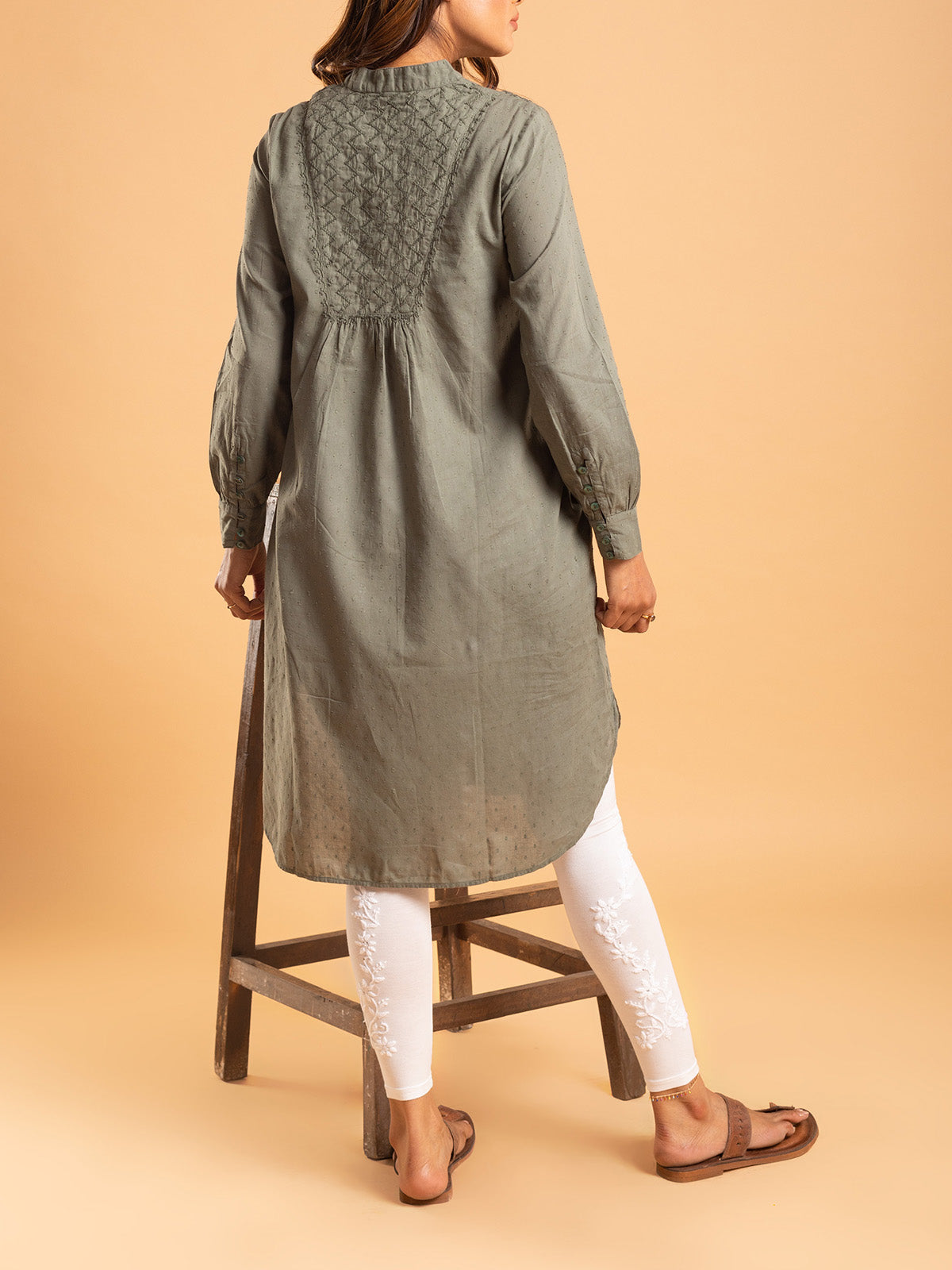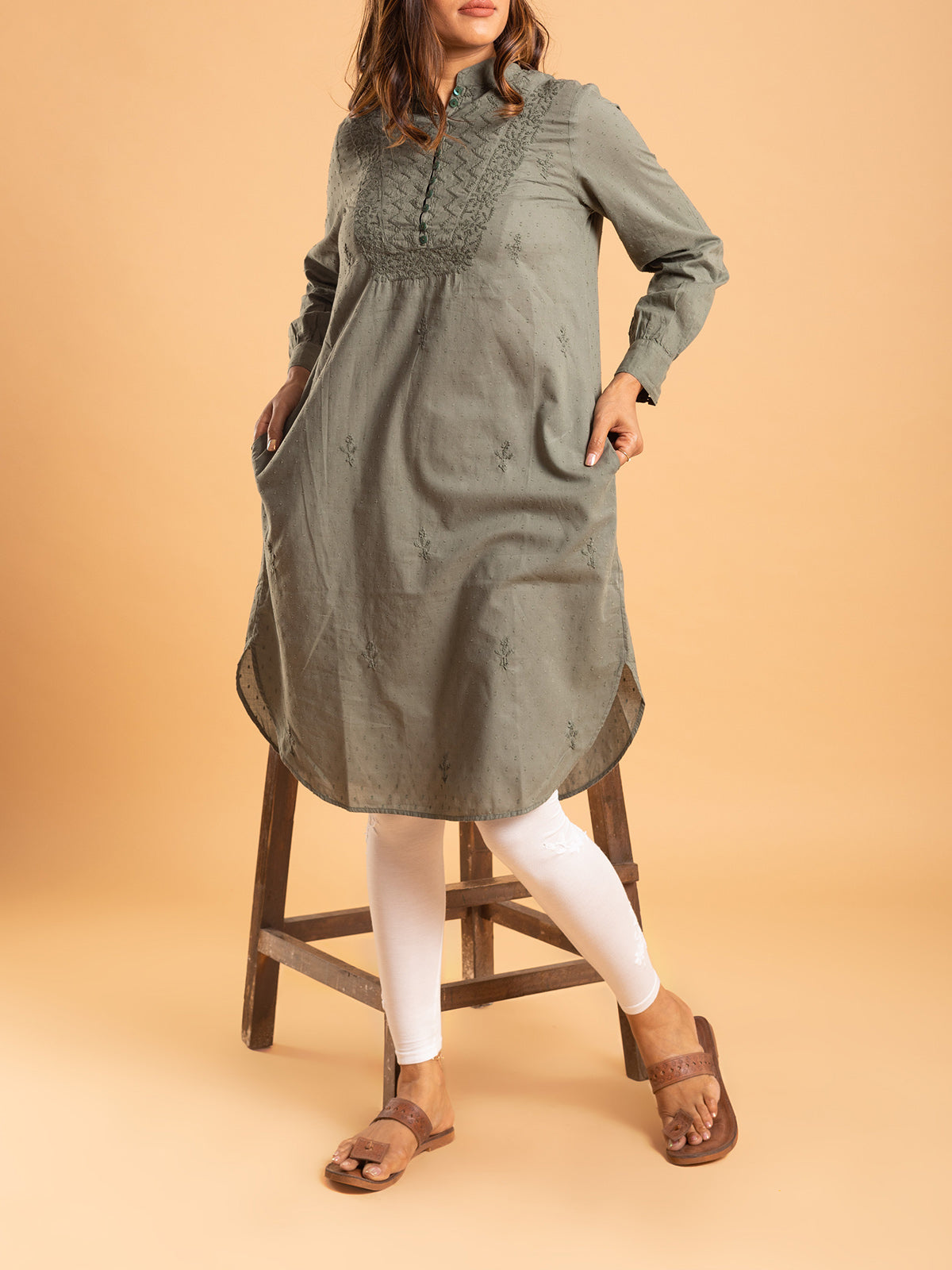 This shirt tunic made in mul has a stright fit with pockets and long sleeves that have buttons on the cuff. It is hand embroidered with Chikankari motifs.