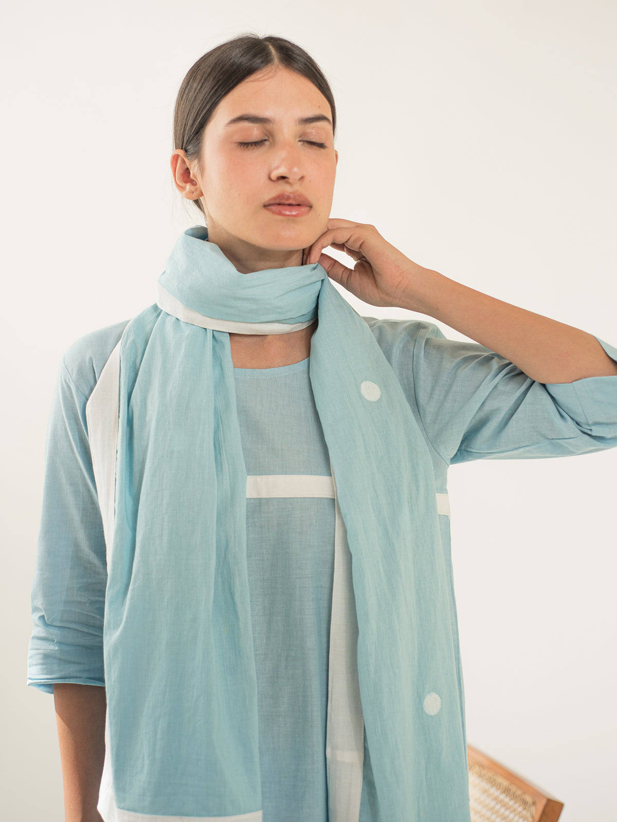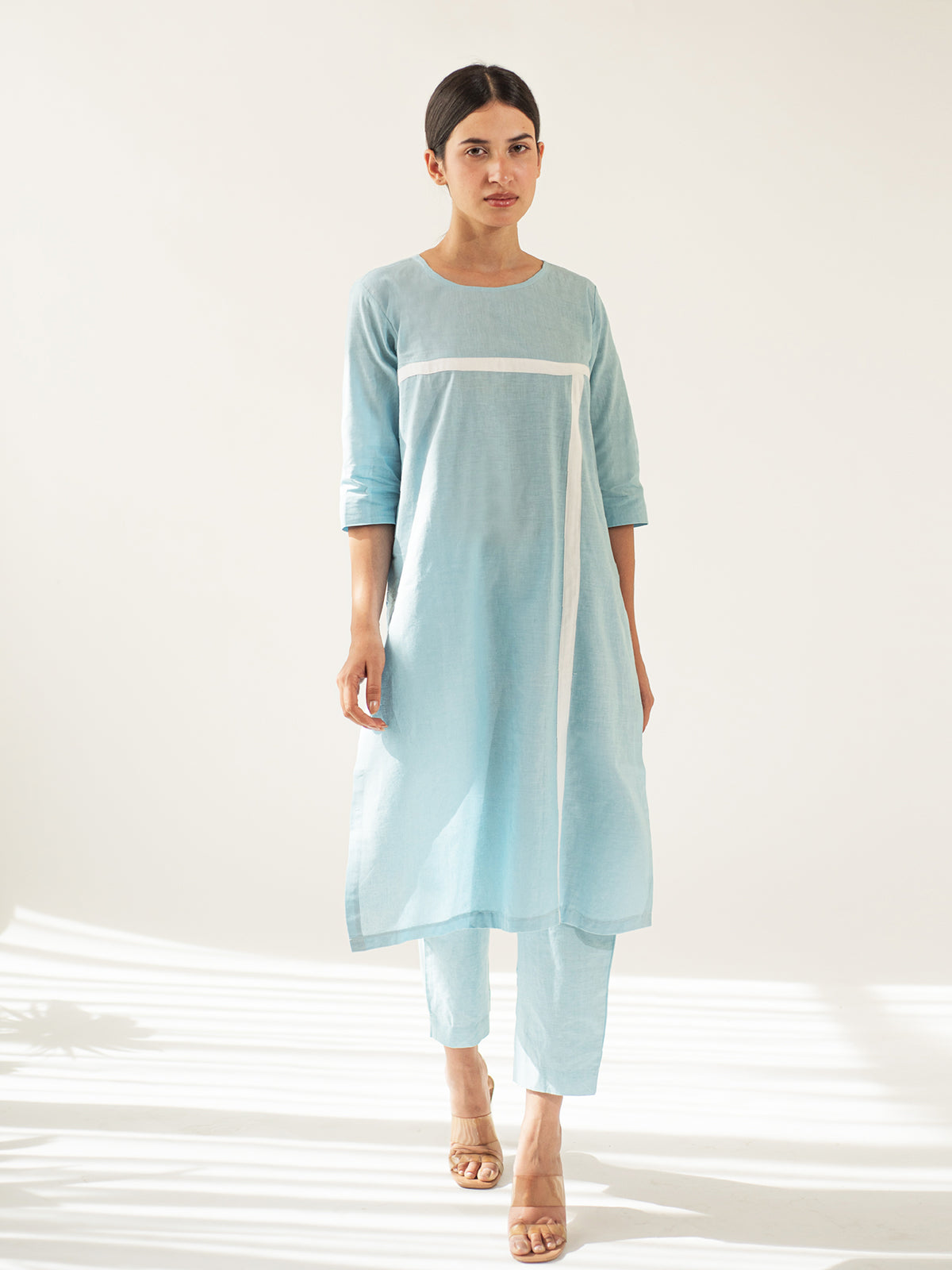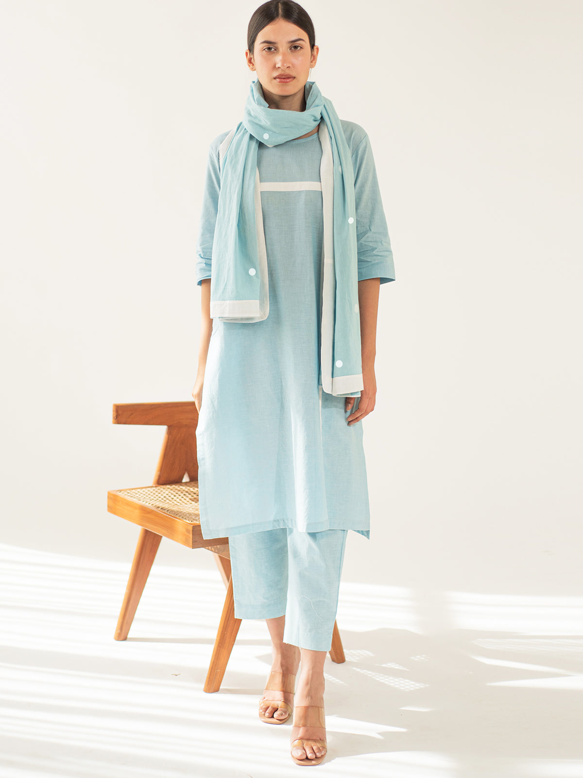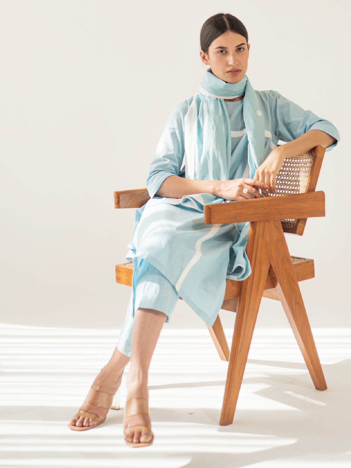 Celebrate handcrafted charm with this three-piece set featuring a blue applique tunic, matching pants, and a hand block printed polka dupatta. Designed in soft cotton with comfortable tailoring, it's perfect for festive or relaxed elegant looks.