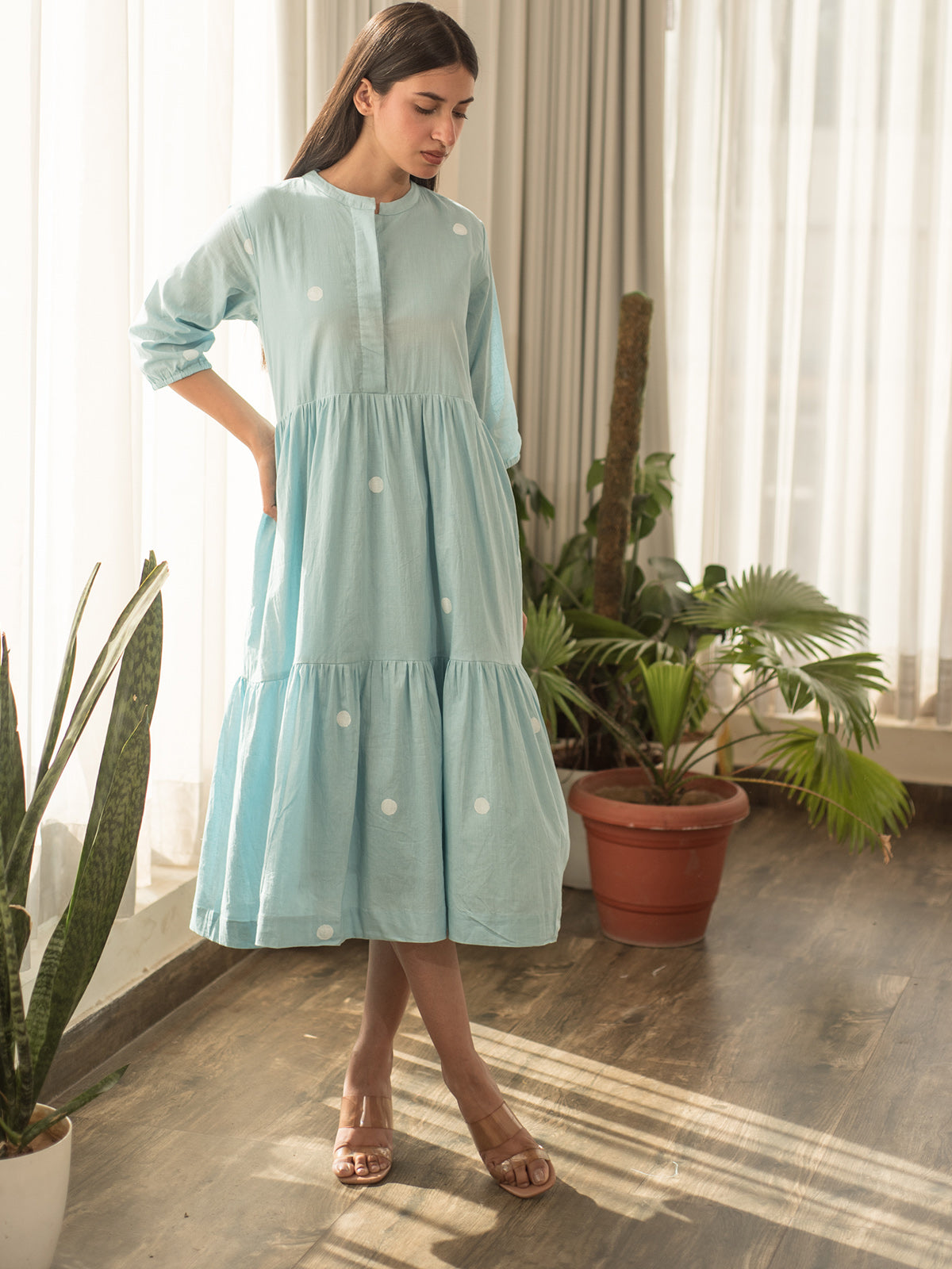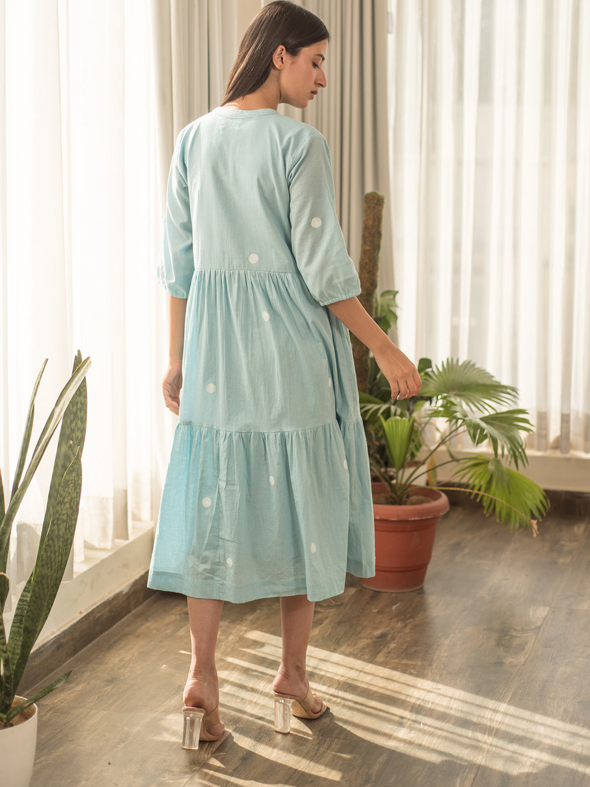 This tiered dress in rich blue features handblock printed polka dots and a fully lined interior for structure and comfort. The softly tiered silhouette flows beautifully, creating a vintage-meets-modern vibe that’s both playful and elegant.