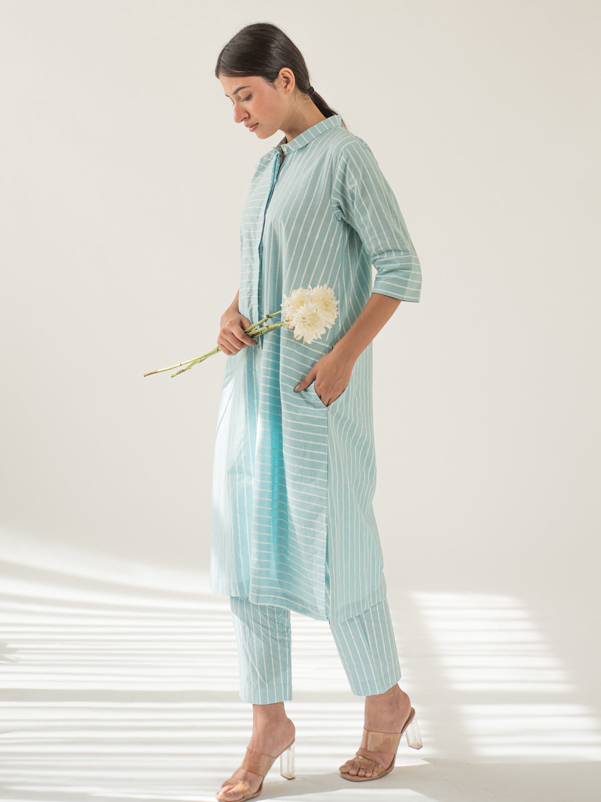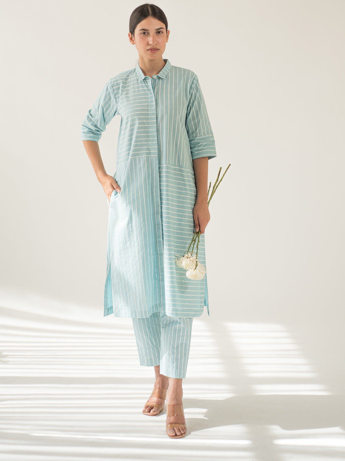 This two-piece co-ord set includes a blue striped shirt dress and matching pants, both featuring hand block prints. Tailored yet easygoing, it's a refined ensemble for modern, artisanal-inspired dressing.