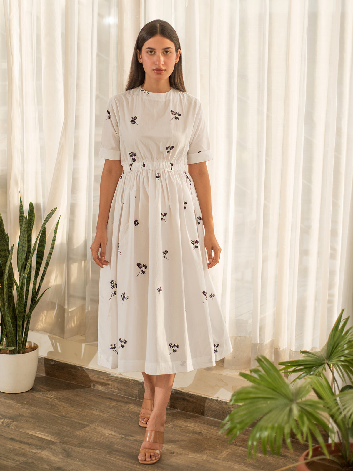 This indigo tier dress features a softly gathered three-tiered structure with white printed accents. Designed with an elasticated waist for shape and comfort, it's a breezy, artisan-inspired piece perfect for transitional weather.