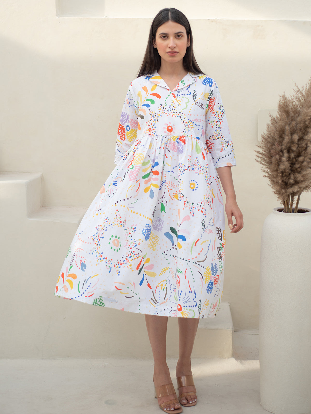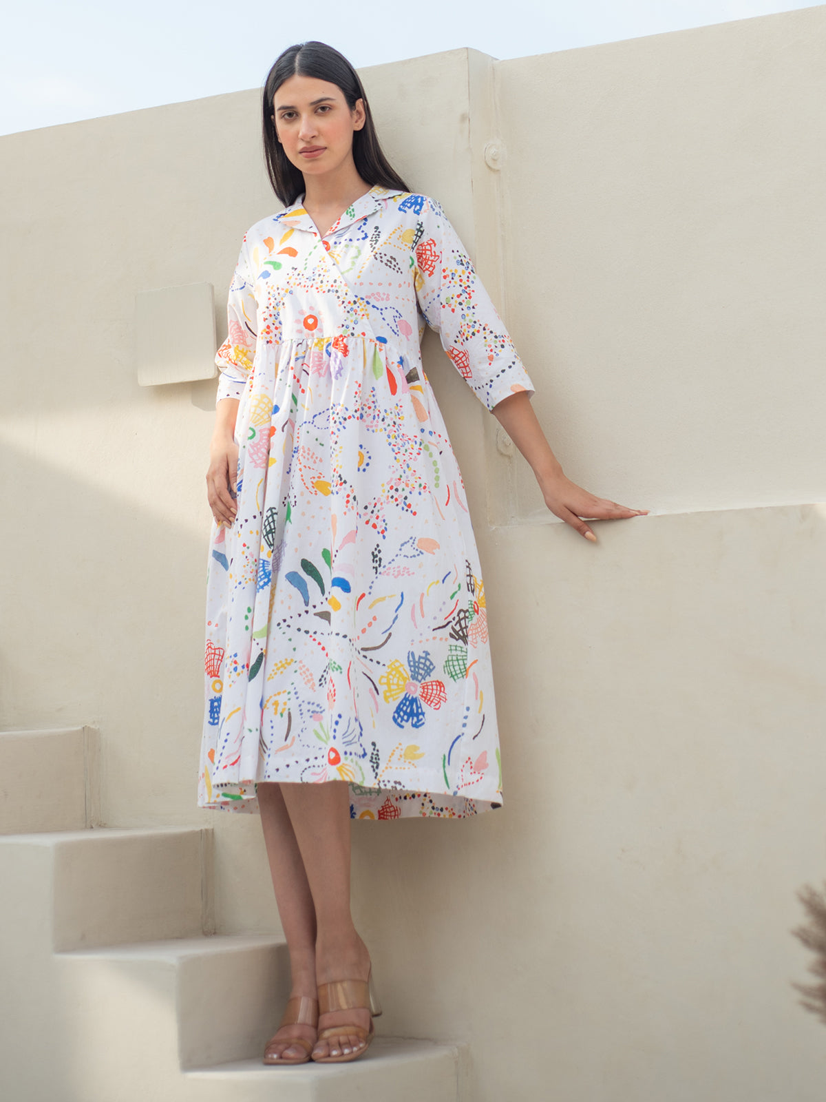 Elegant and detailed, this cotton dress features intricate digital prints with a Cuban collar overlap neck and 3/4 sleeves. The silhouette flows effortlessly, making it ideal for casual sophistication.
