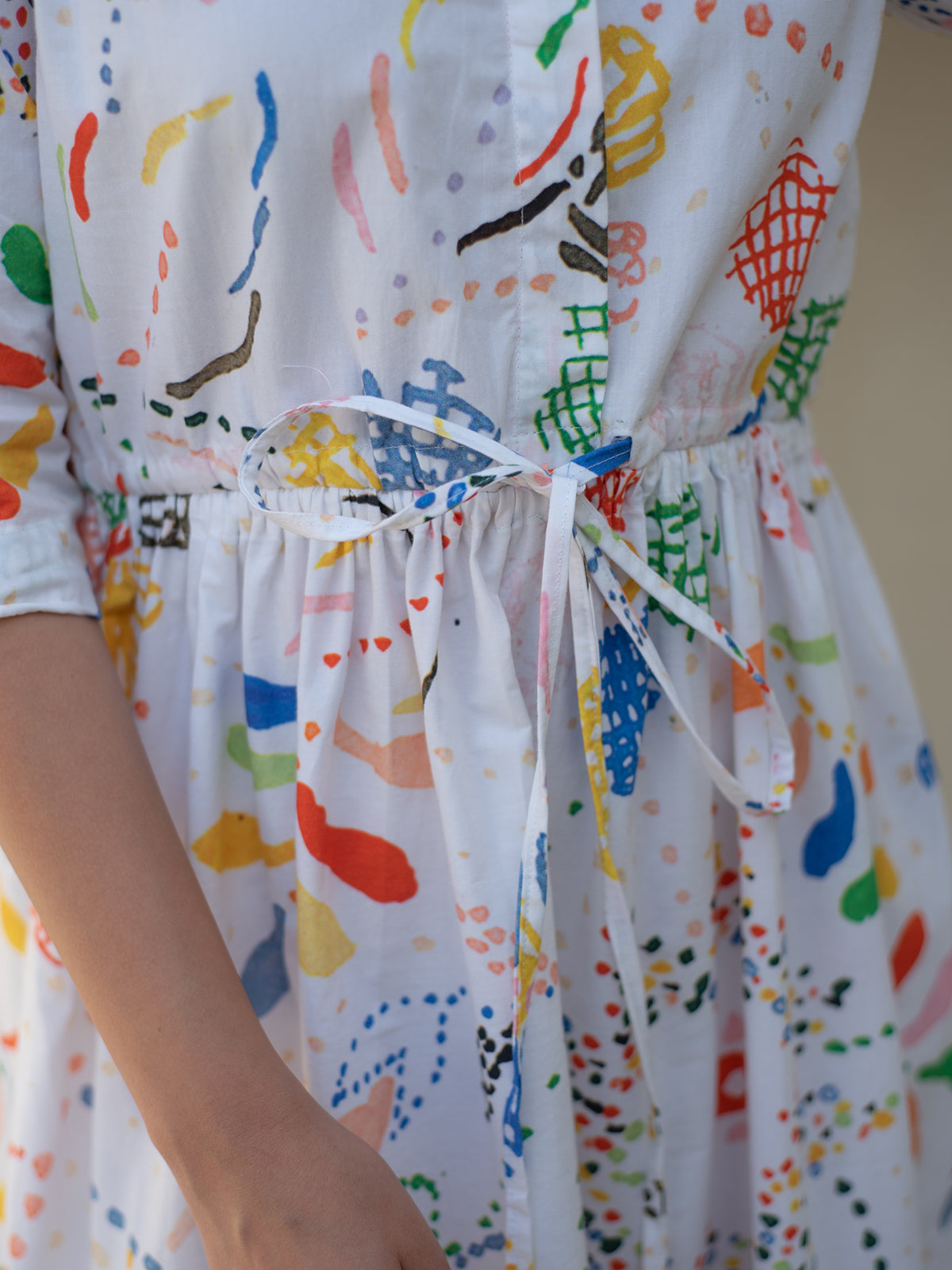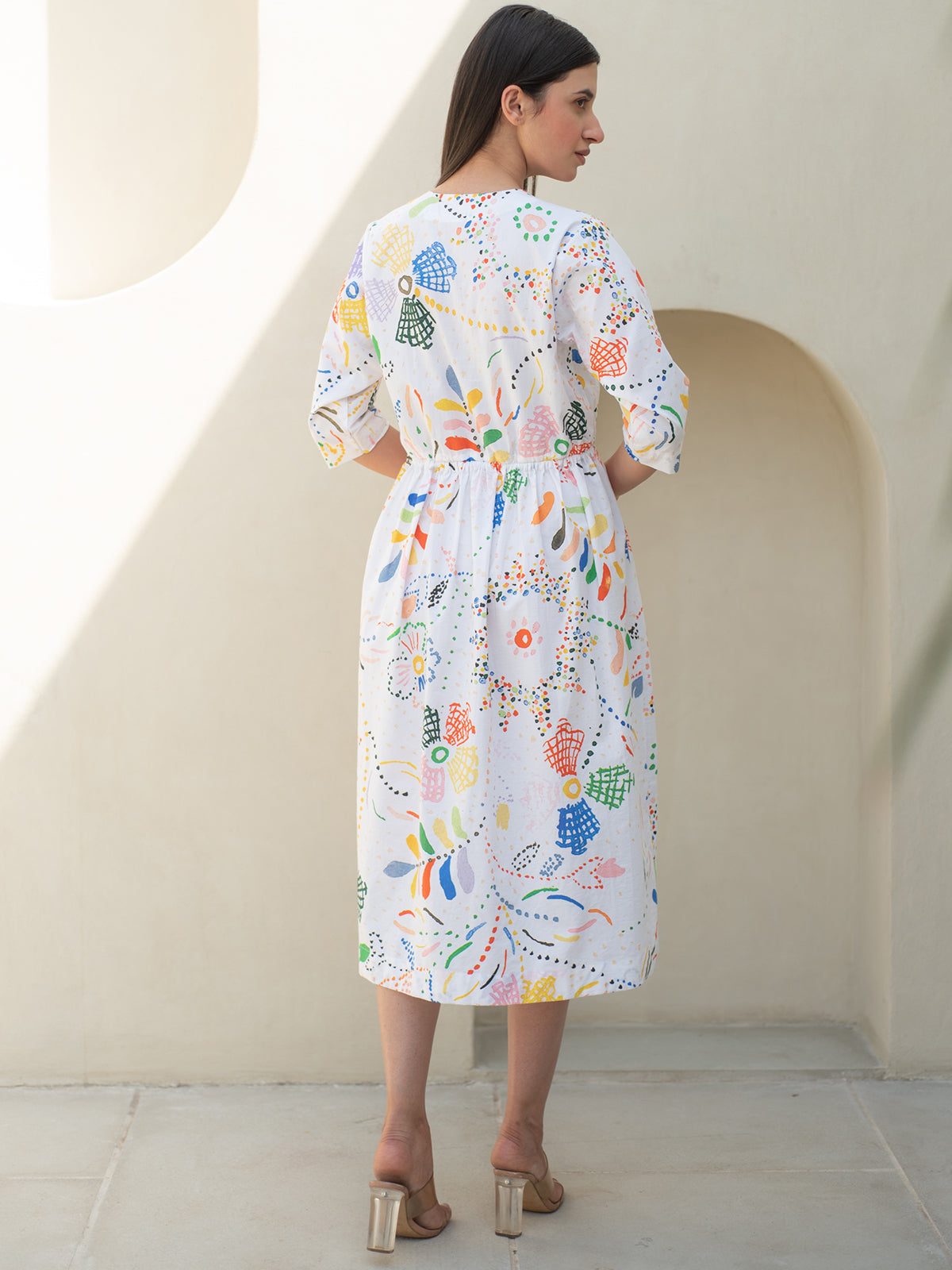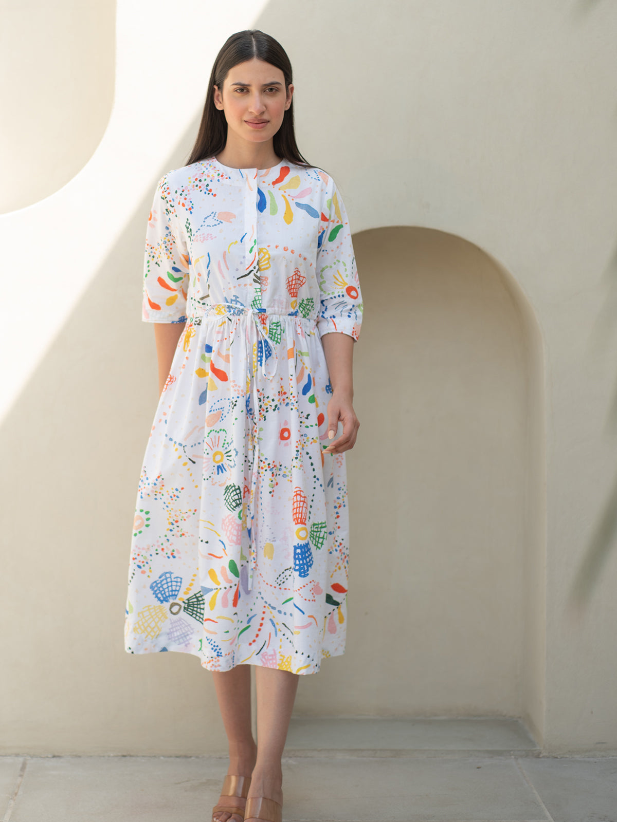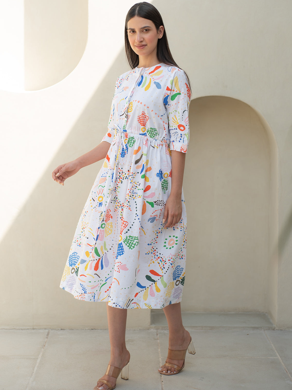This cotton dress features elaborate digital prints and a flattering elasticated waist for an easy fit. The round neckline and 3/4 sleeves enhance its graceful silhouette, perfect for both casual and dressy outings.