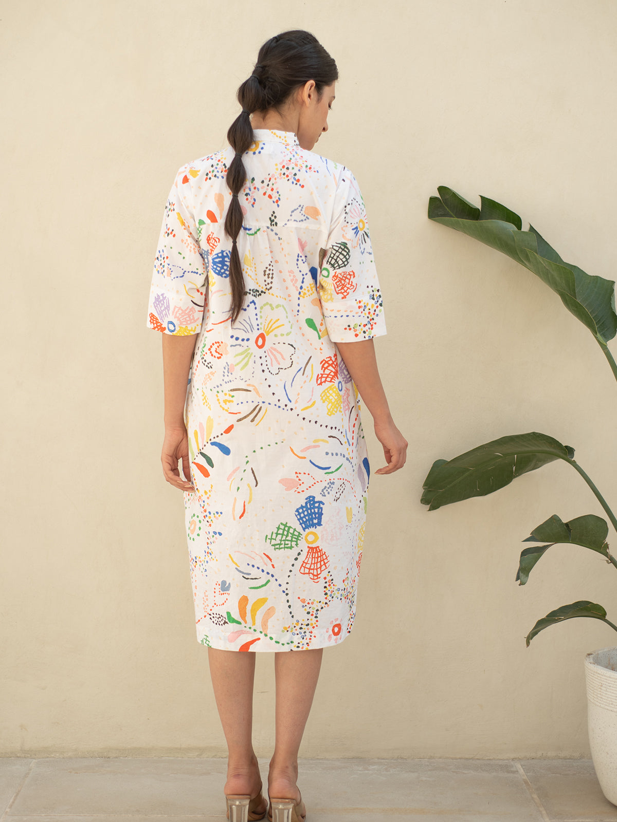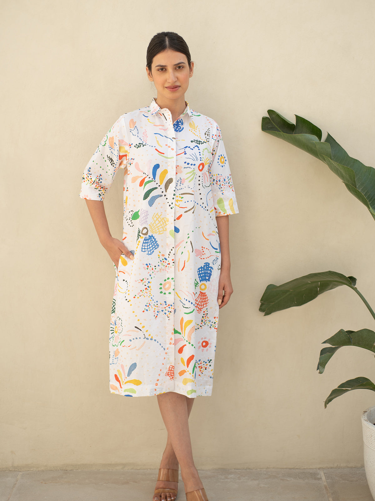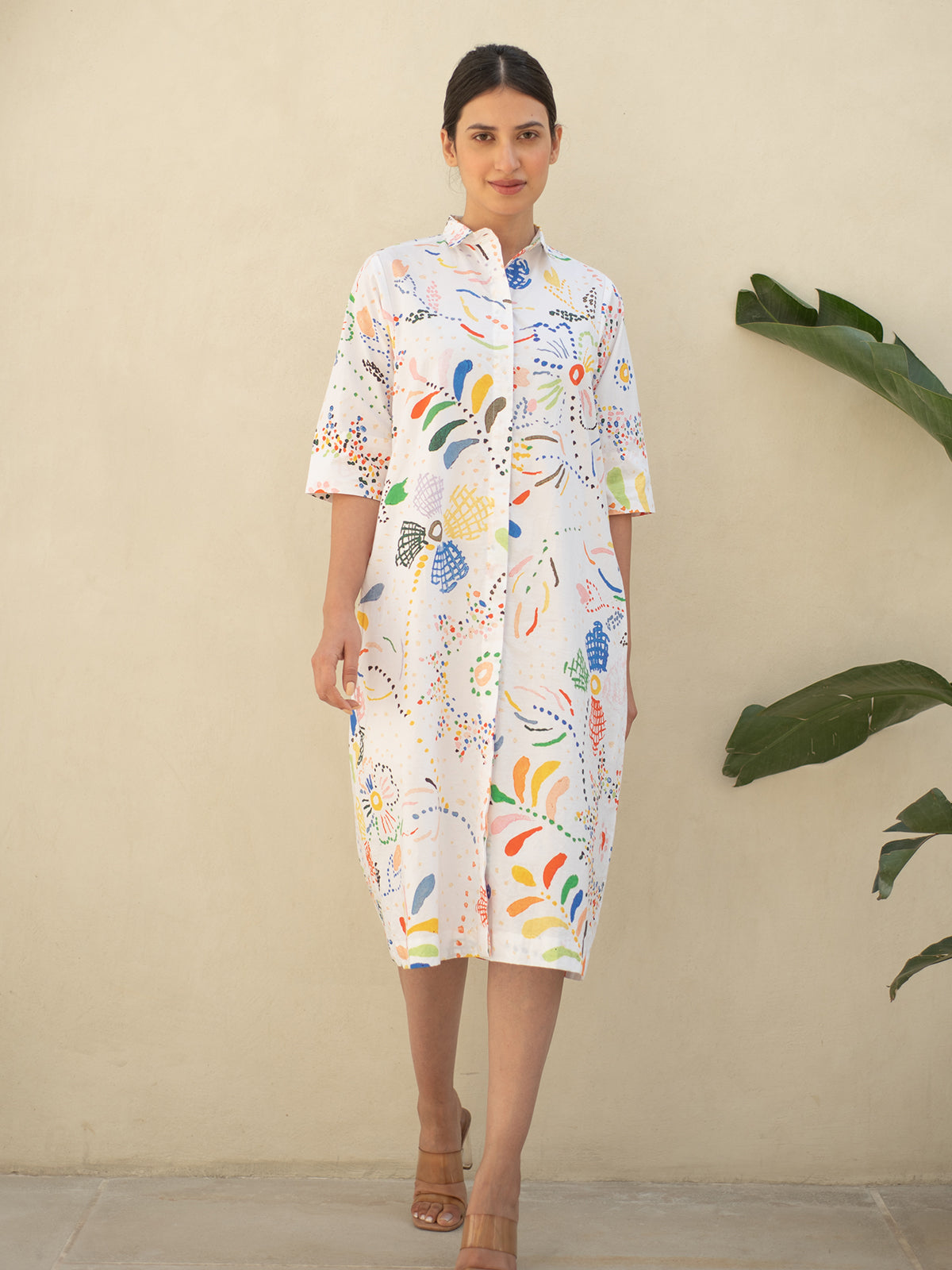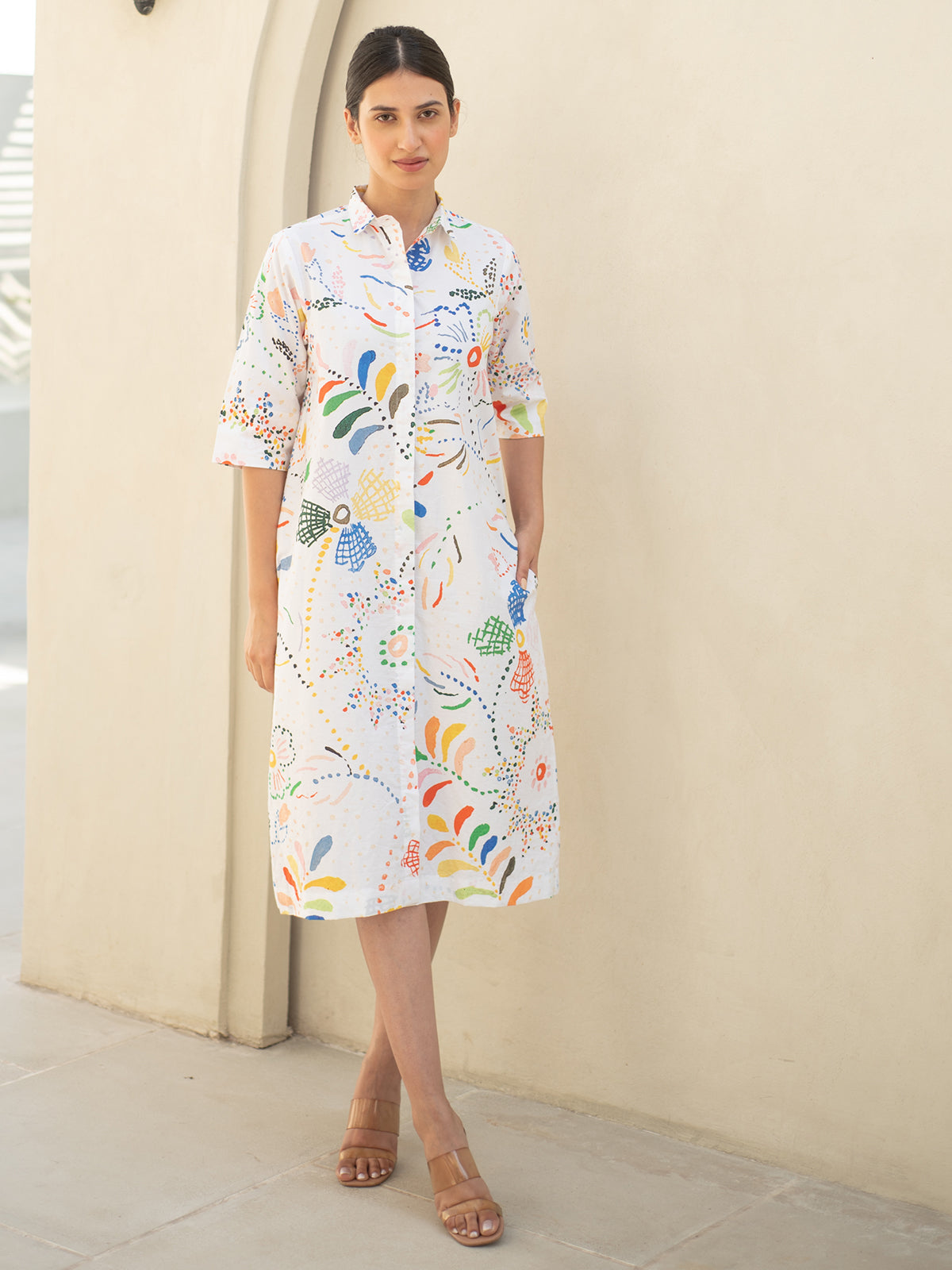 This refined shirt-style cotton dress features intricate digital prints that lend a touch of sophistication. Designed with a shirt collar and 3/4 sleeves, it blends structure with softness for a look that’s effortlessly elegant.