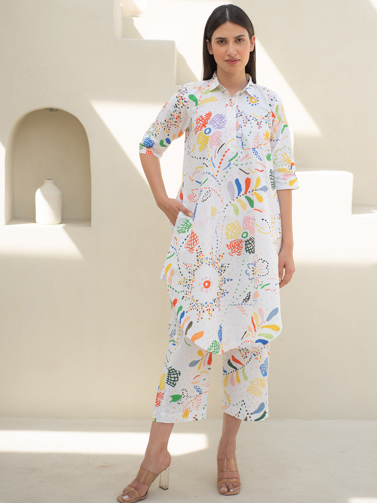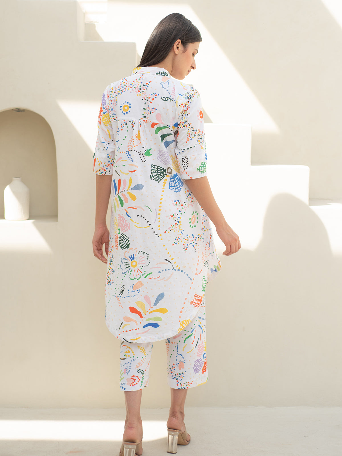 An artistic ensemble, this two-piece cotton set pairs an intricately printed tunic with a collar neck and 3/4 sleeves, alongside matching pants with a fully elasticated waist and functional pockets — a perfect blend of style and ease.