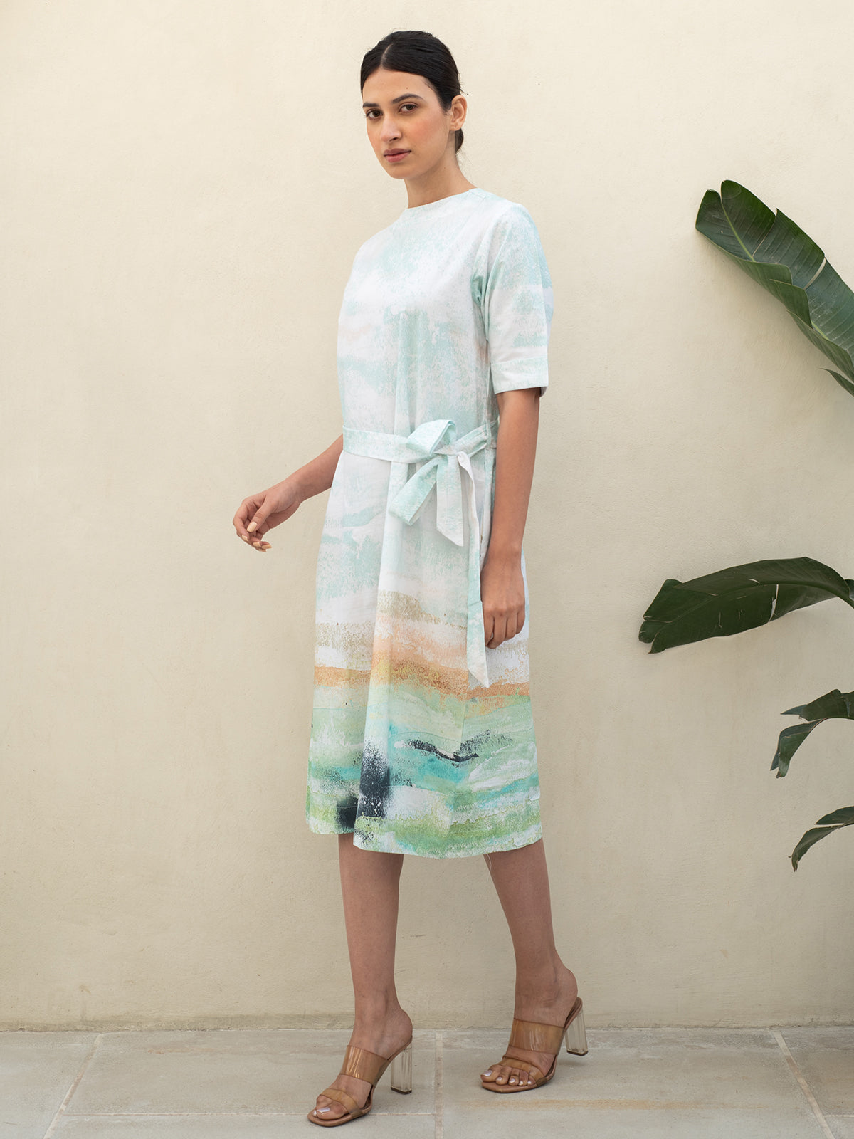 This belt dress features moss green digital prints on soft cotton, designed with a round neckline and 3/4 sleeves. The belted waist enhances the silhouette, making it both flattering and versatile.