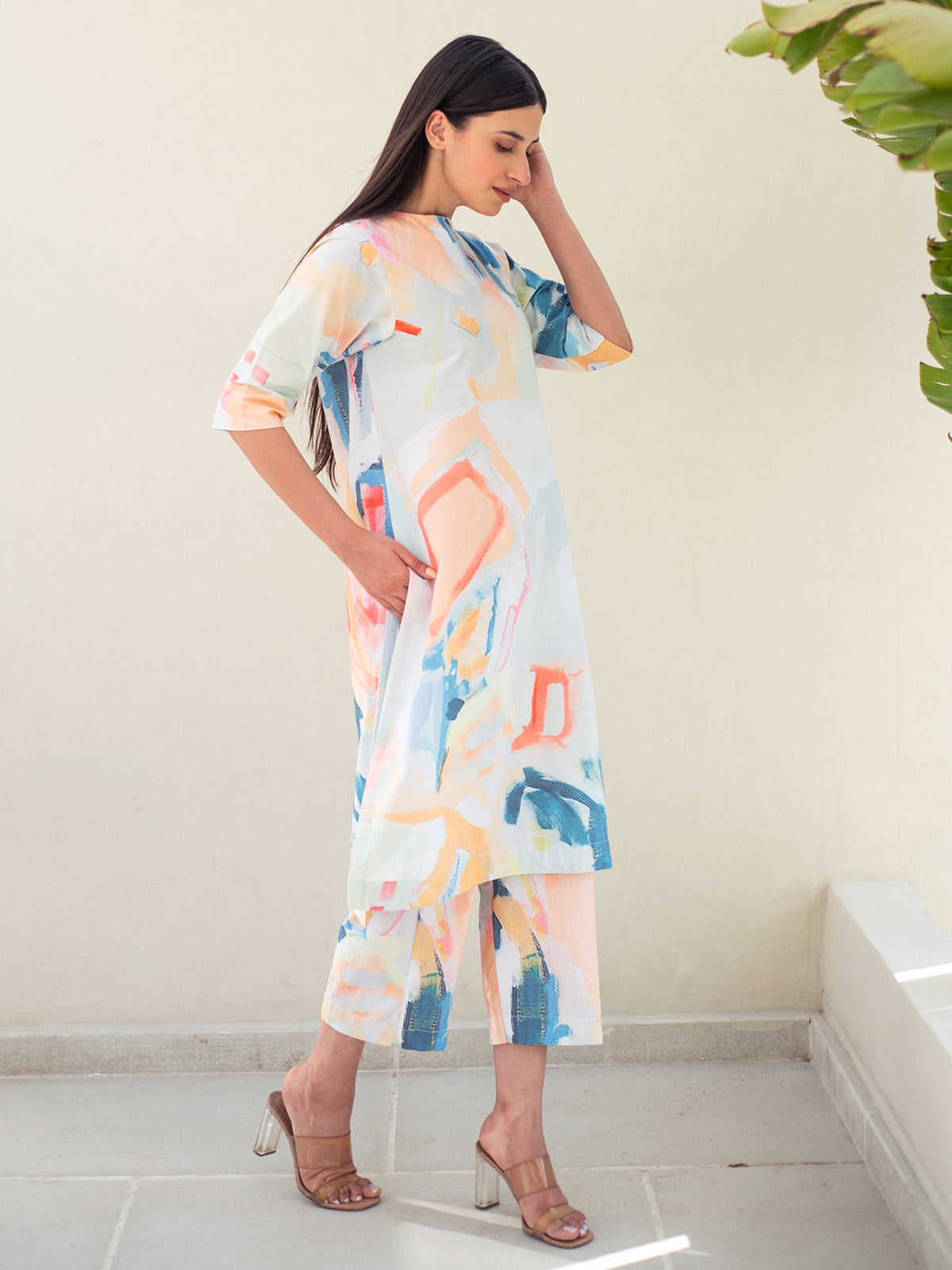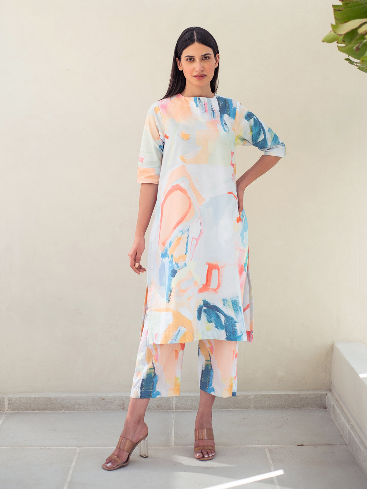 A riot of colors and comfort, this tunic-pant set features multicolour abstract digital prints on breathable cotton. The round neck tunic with 3/4 sleeves pairs with elasticated pants with pockets — effortlessly artsy and functional.
