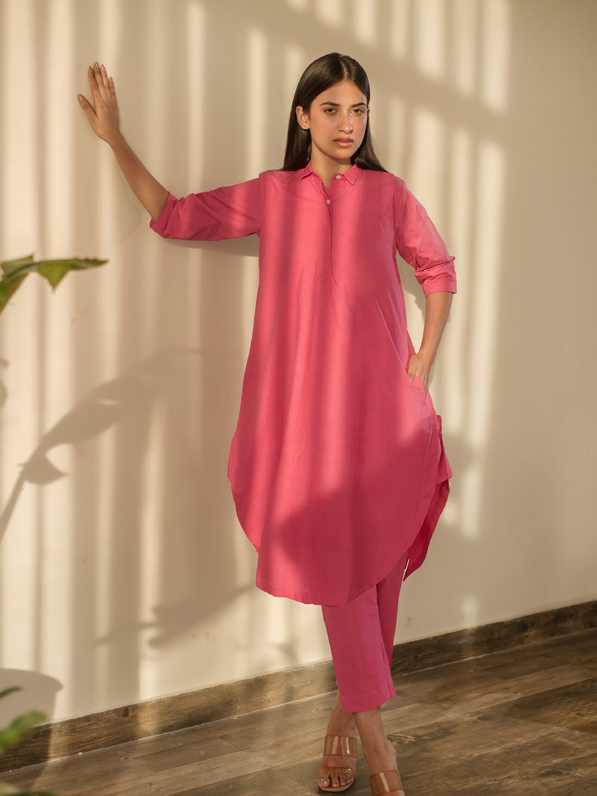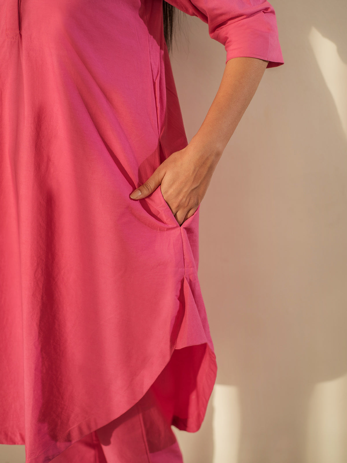 Brighten your wardrobe with this two-piece co-ord set featuring a rani pink tunic and contrasting blue pants. Crafted in cotton, the shirt-style tunic offers a structured neckline, while the pants come with an elastic waist — bold yet balanced for modern dressing.