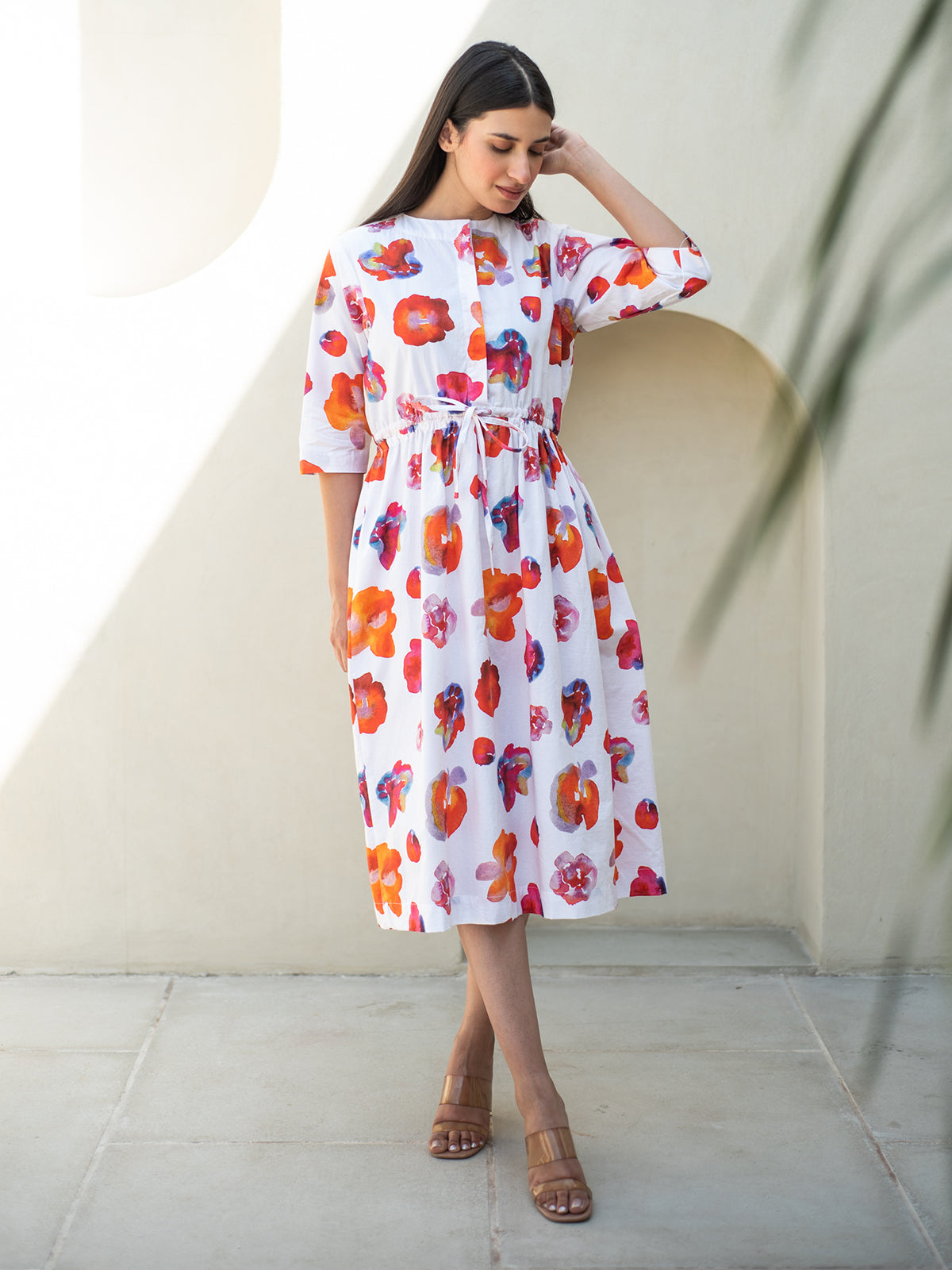 With soft rose-themed digital prints on breathable cotton, this dress combines romance and ease. The elasticated waist gently hugs the figure, while the round neck and 3/4 sleeves create a balanced, airy look.