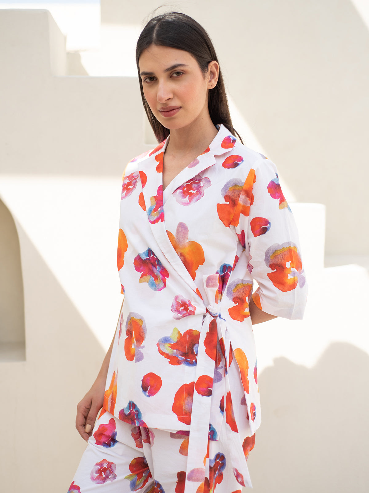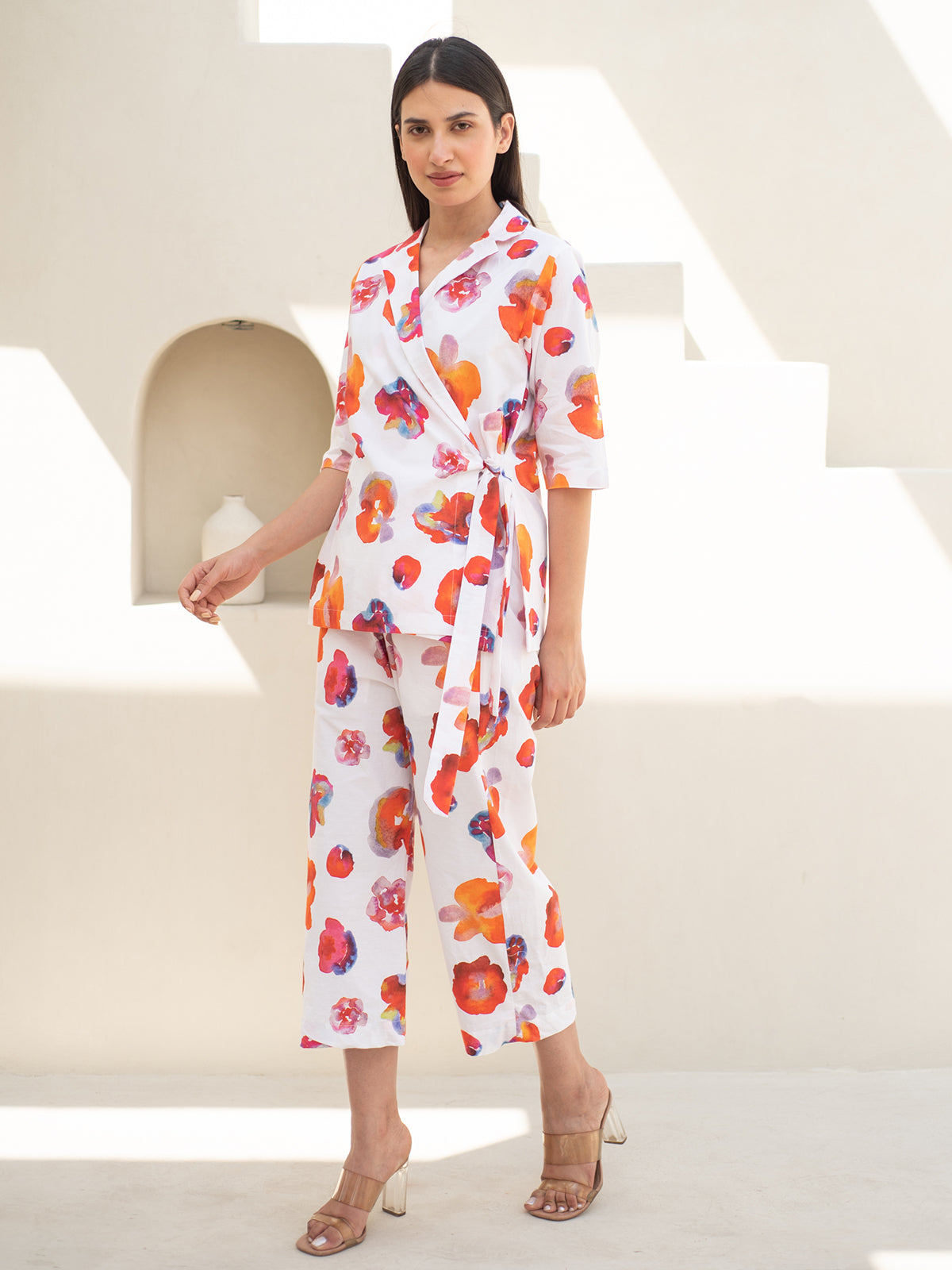 Delicately detailed with rose digital prints, this cotton co-ord features a collar overlap jacket with 3/4 sleeves and matching pants. The full elasticated waist and side pockets offer function without sacrificing flair.