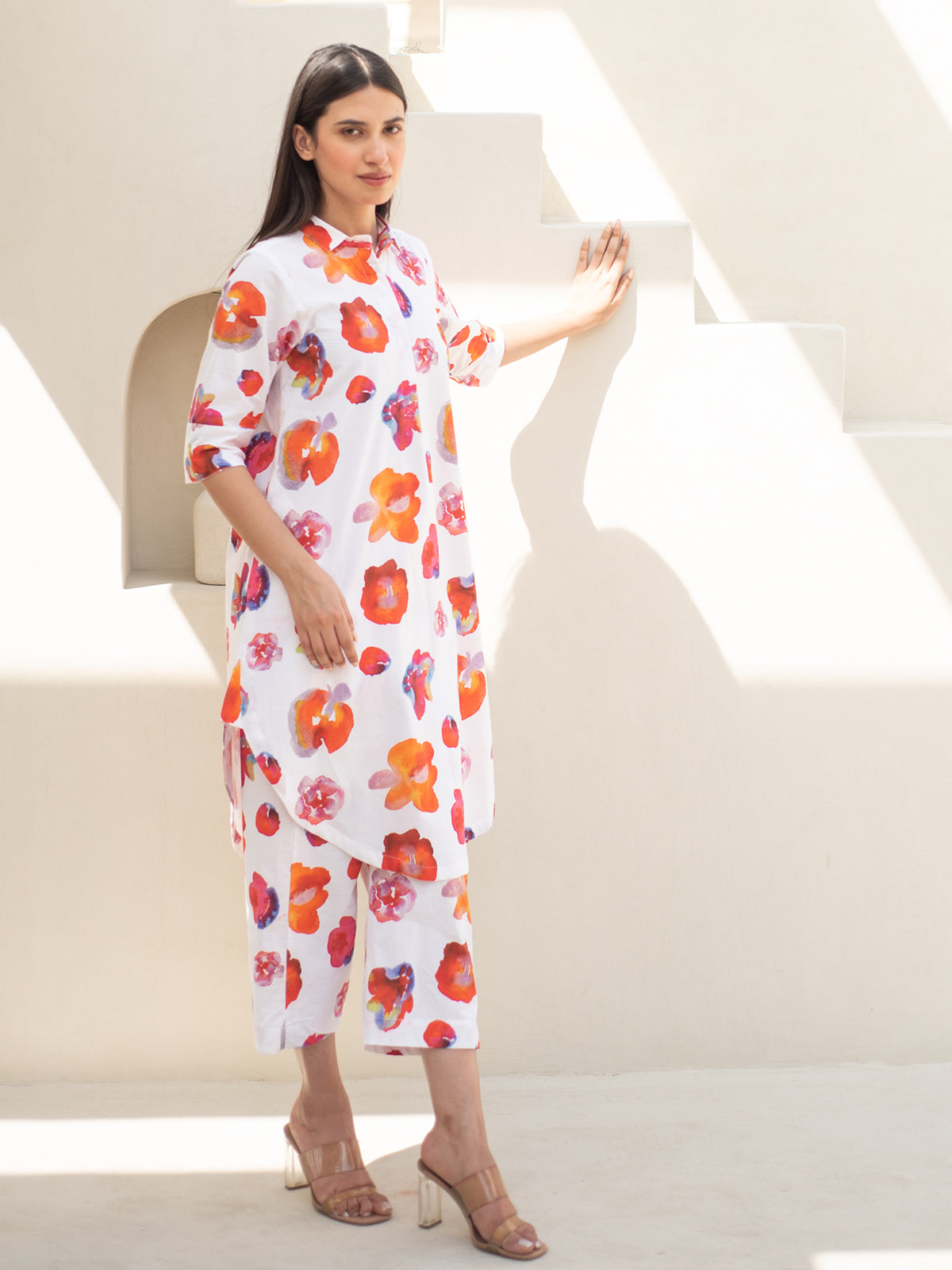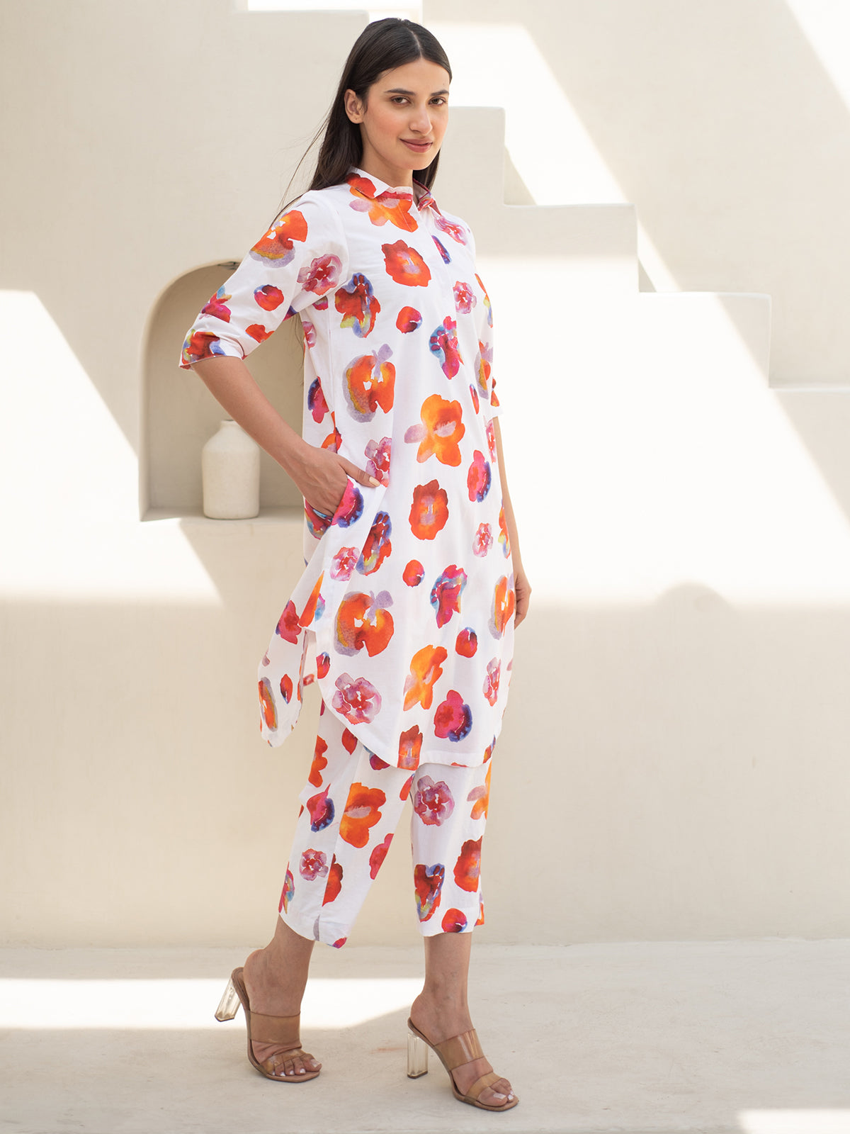 Romantic and refined, this cotton tunic and pant set features rose-inspired digital prints. The tunic’s collar neck and 3/4 sleeves complement the relaxed pants, offering all-day comfort with an effortlessly elegant look.