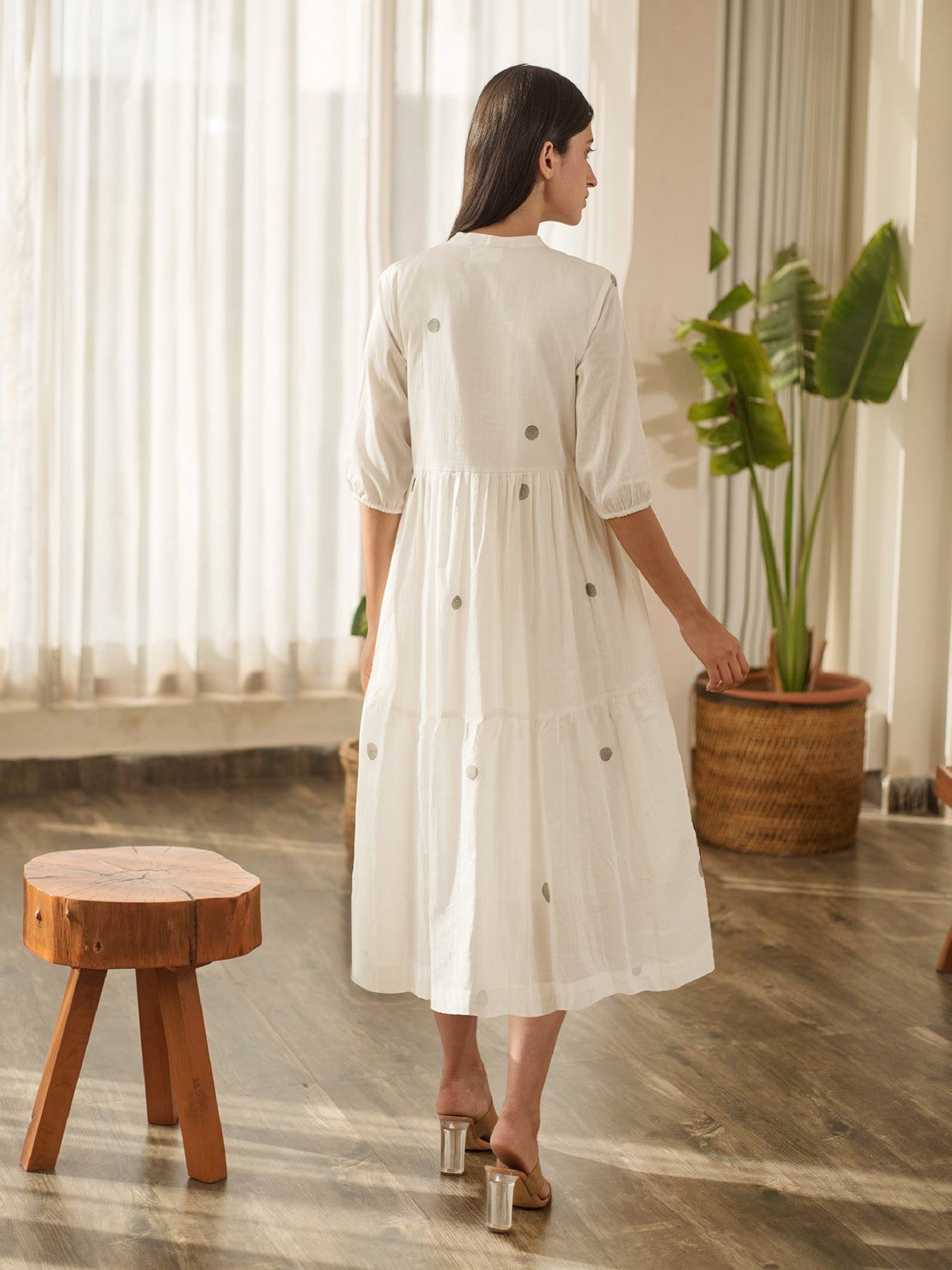 Handcrafted with care, this white tier dress is adorned with hand block printed polka dots. Fully lined for comfort, it flows with every step, exuding charm and refined casual elegance.