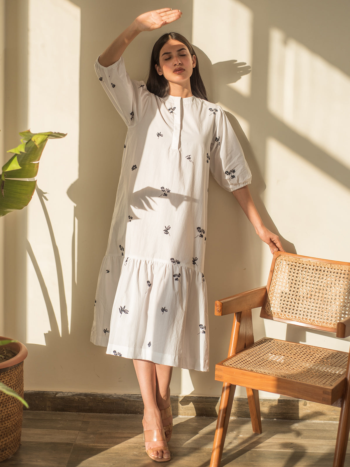 Crafted in crisp cotton poplin, this white bottom flare dress features all-over digital prints with elasticated sleeves. The understated elegance and airy silhouette make it a versatile pick for both casual settings and relaxed occasions.