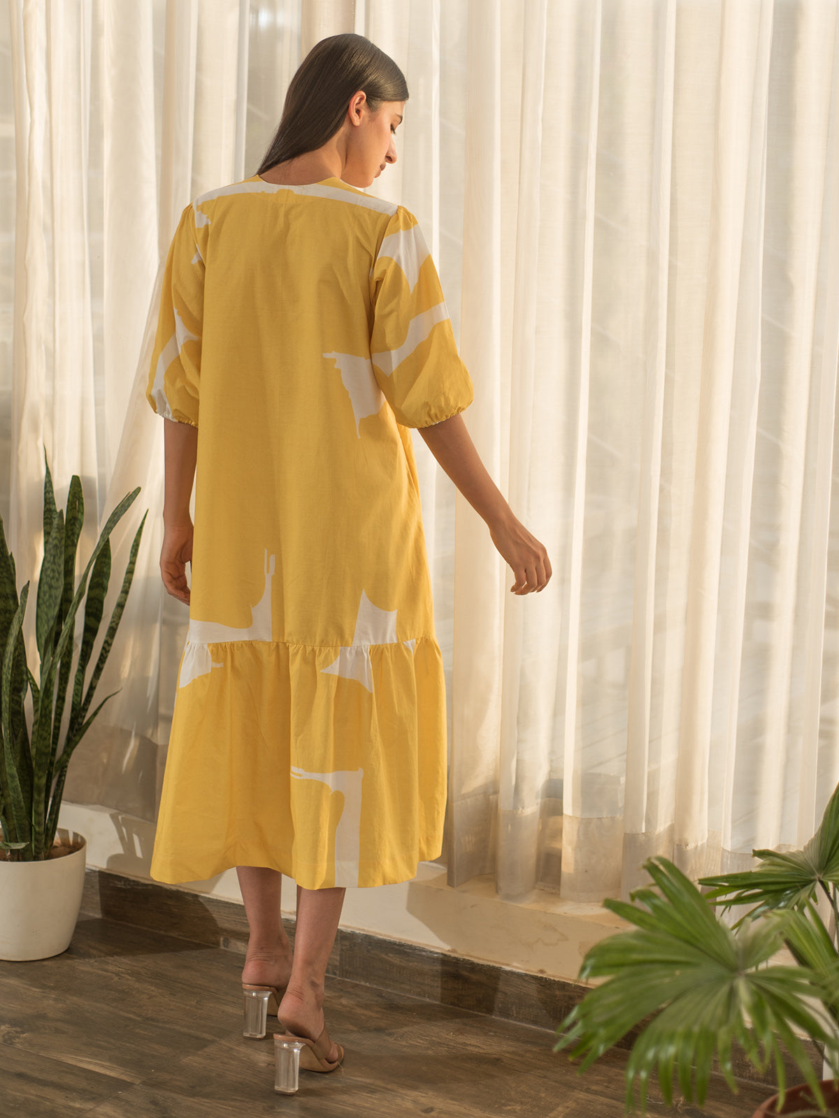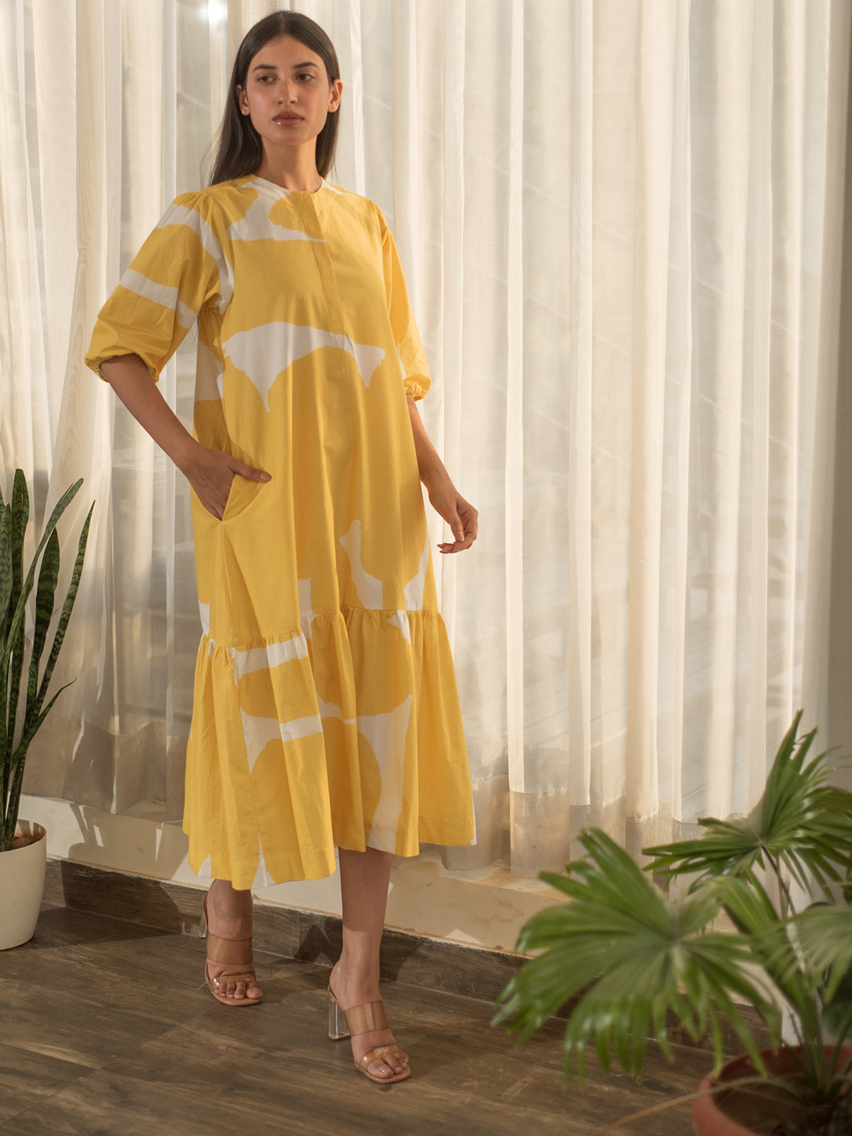 This eye-catching yellow bottom flare dress is made from cotton poplin and features vibrant abstract prints. Designed with elasticated sleeves and a flowy flare, it exudes joyful movement and comfort, ideal for sunny days and vibrant moods.