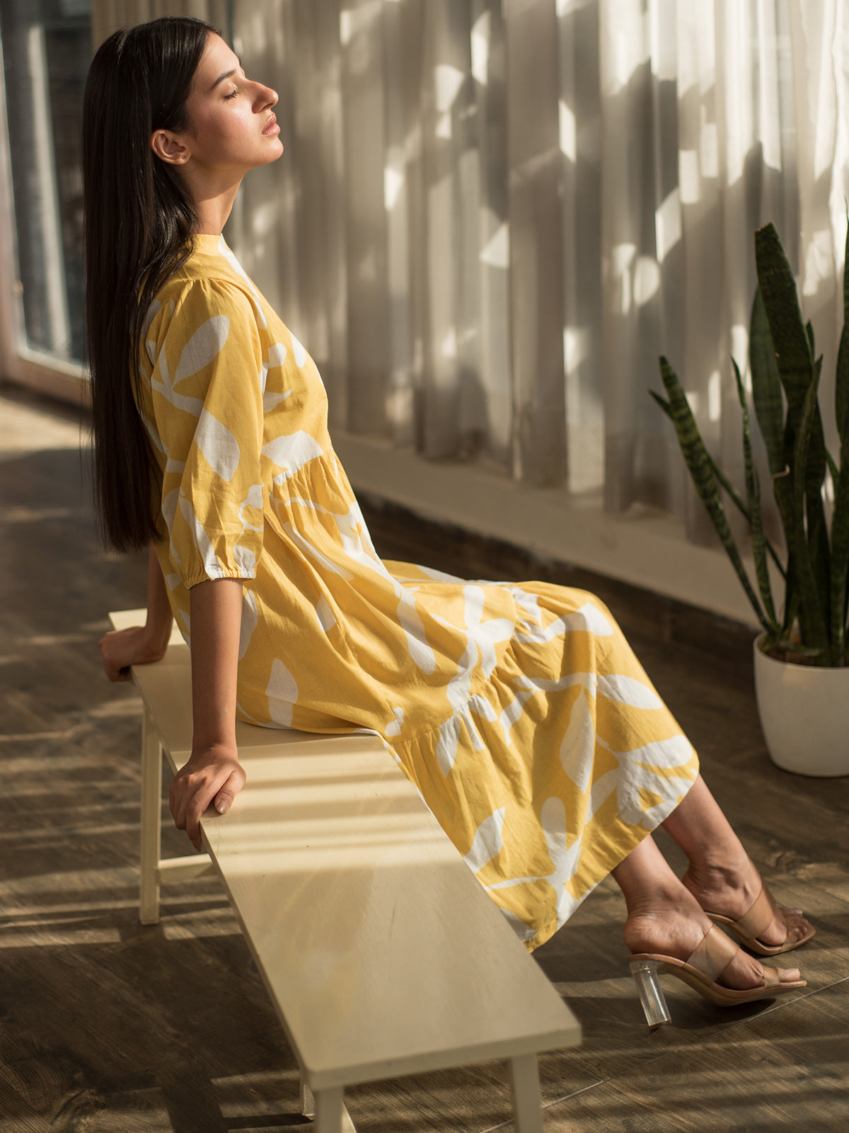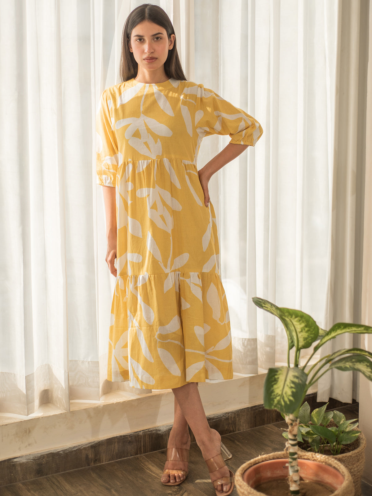 This vibrant tiered dress in yellow cotton poplin showcases delicate floral prints and softly gathered tiers. Elasticated sleeves offer a snug yet airy fit, while the flared structure brings playful movement — a cheerful addition to your summer wardrobe.