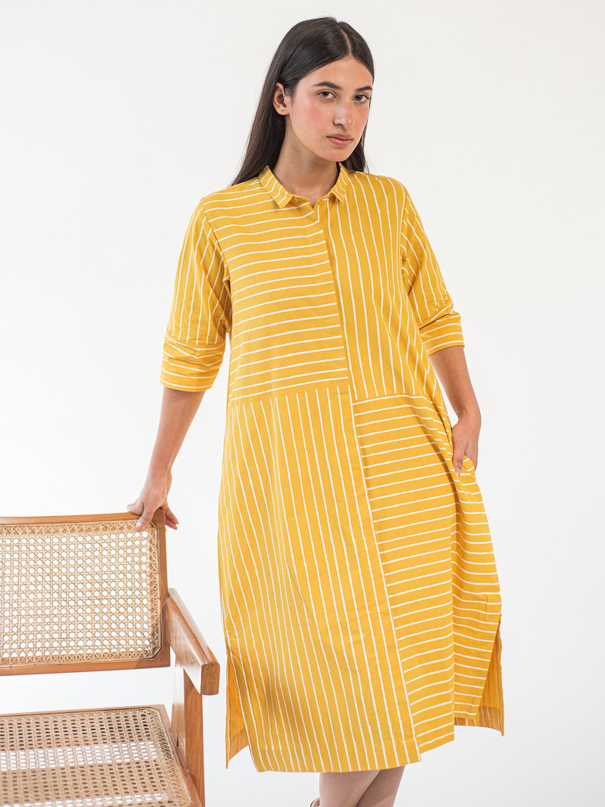 Hand block printed with fine yellow stripes, this shirt dress is tailored in breathable cotton. The classic shirt collar and straight cut make it a versatile and stylish piece for minimal yet thoughtful dressing.