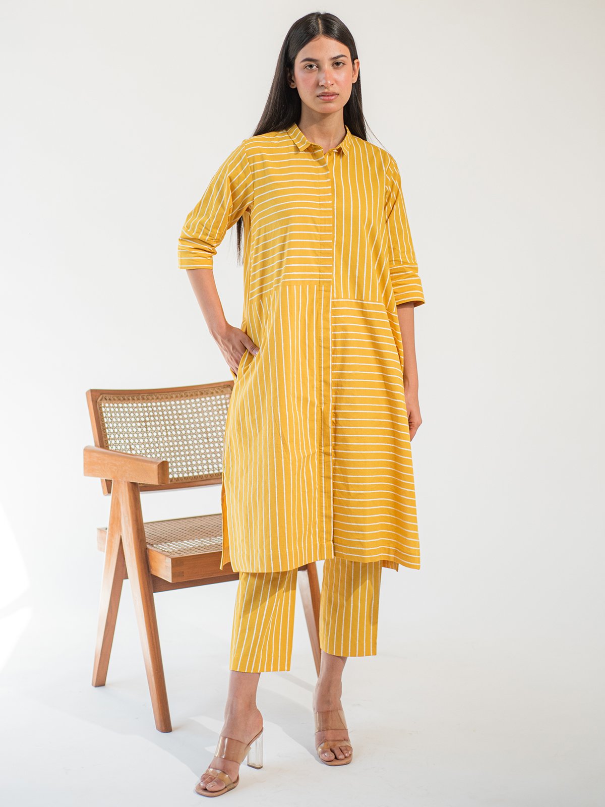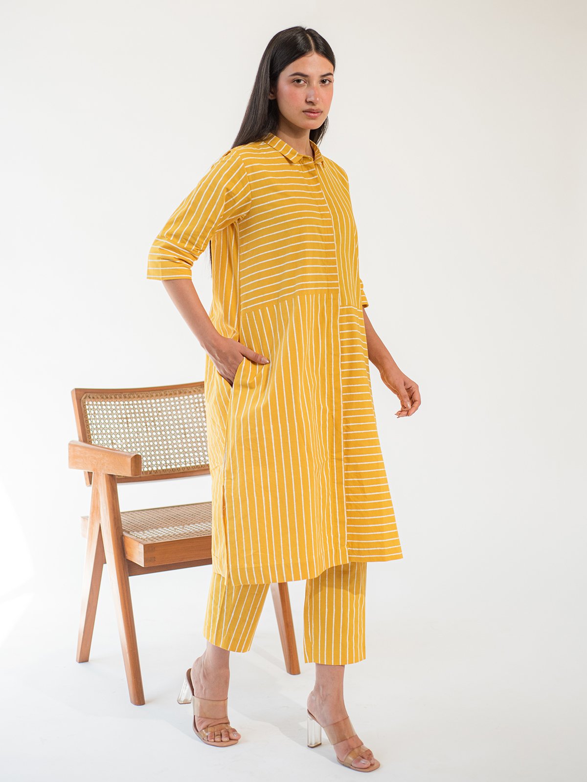 A breezy co-ord set featuring a yellow hand block printed striped shirt dress and matching stripe pants. The tailored collar, straight fit, and coordinated pattern make this a go-to outfit for statement ease.