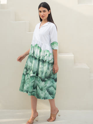 White and Green Cuban Collar Dress