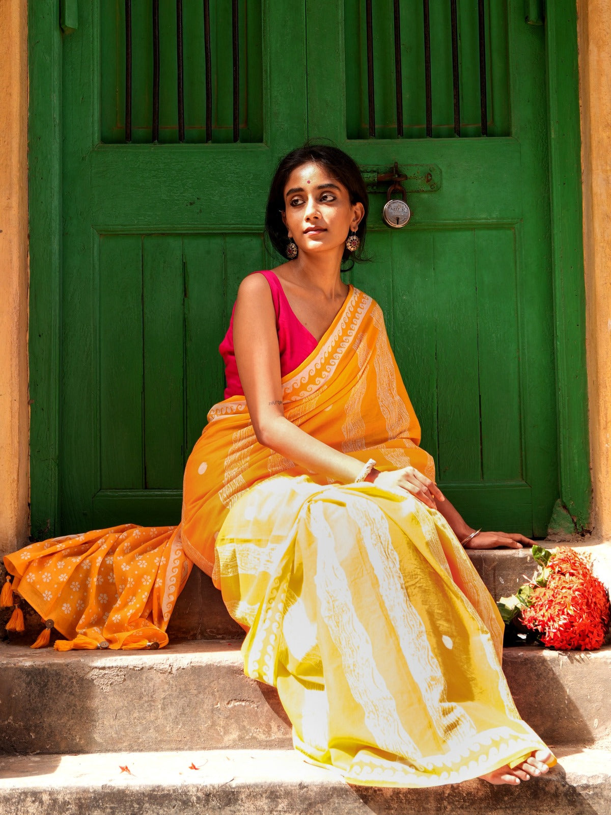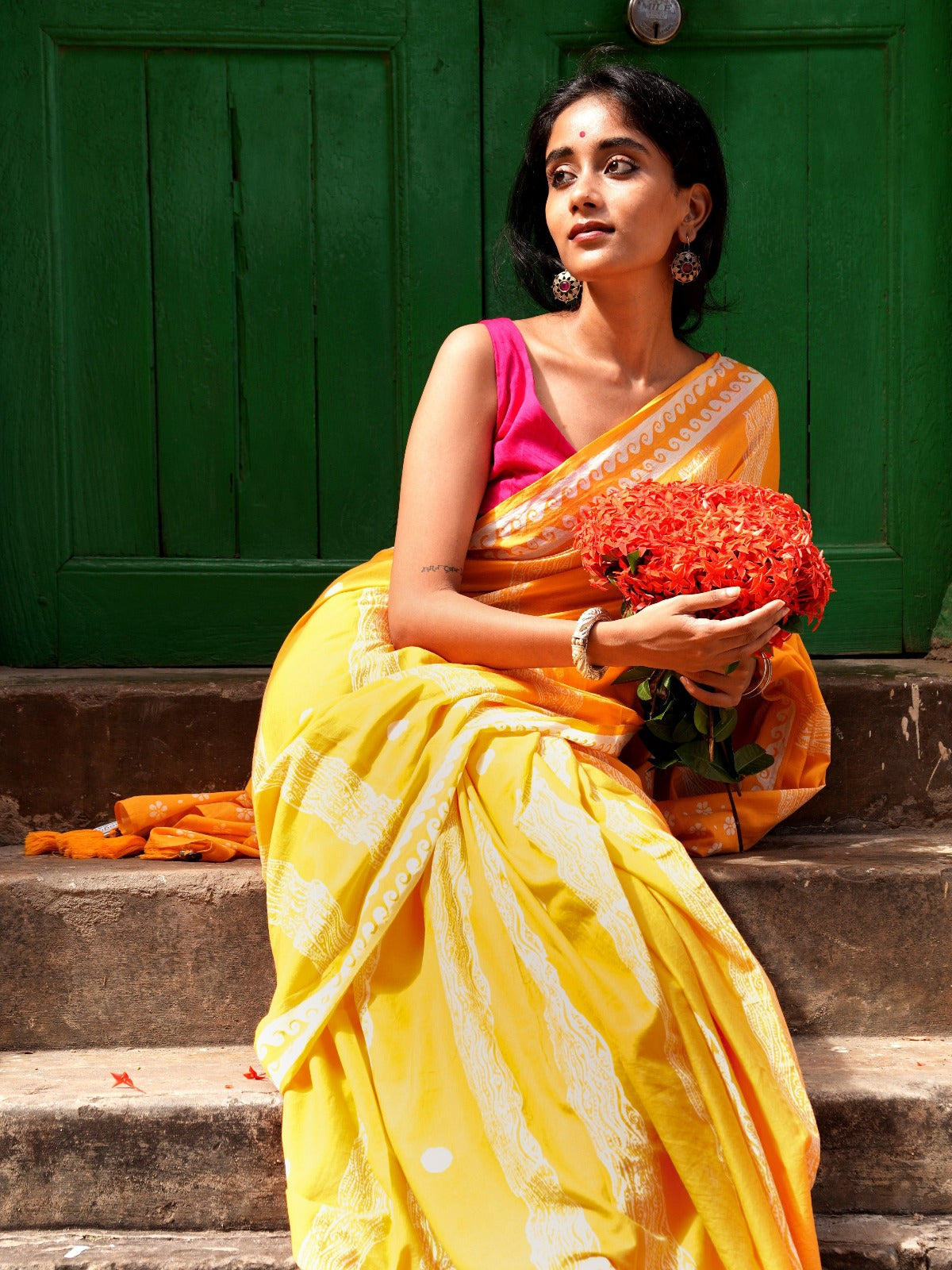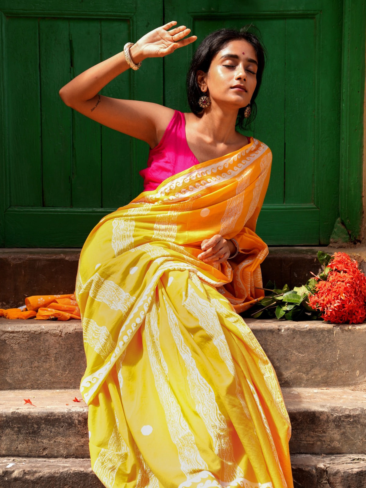 The geometric wave motifs reflect the rhythm and energy of the sea, while the floral pallu brings in a playful contrast like the wild, free-spirited energy you feel when the wind tangles your hair and salt kisses your skin.