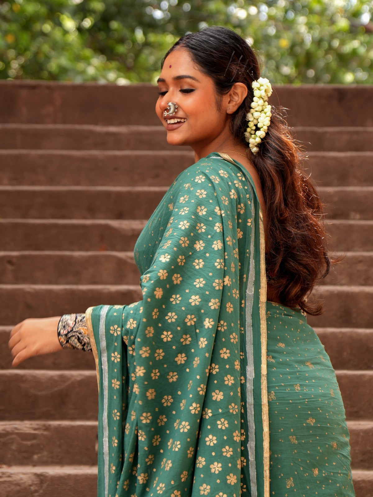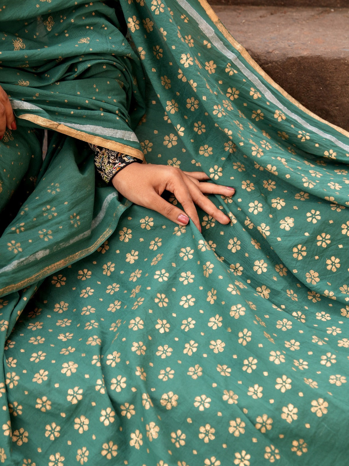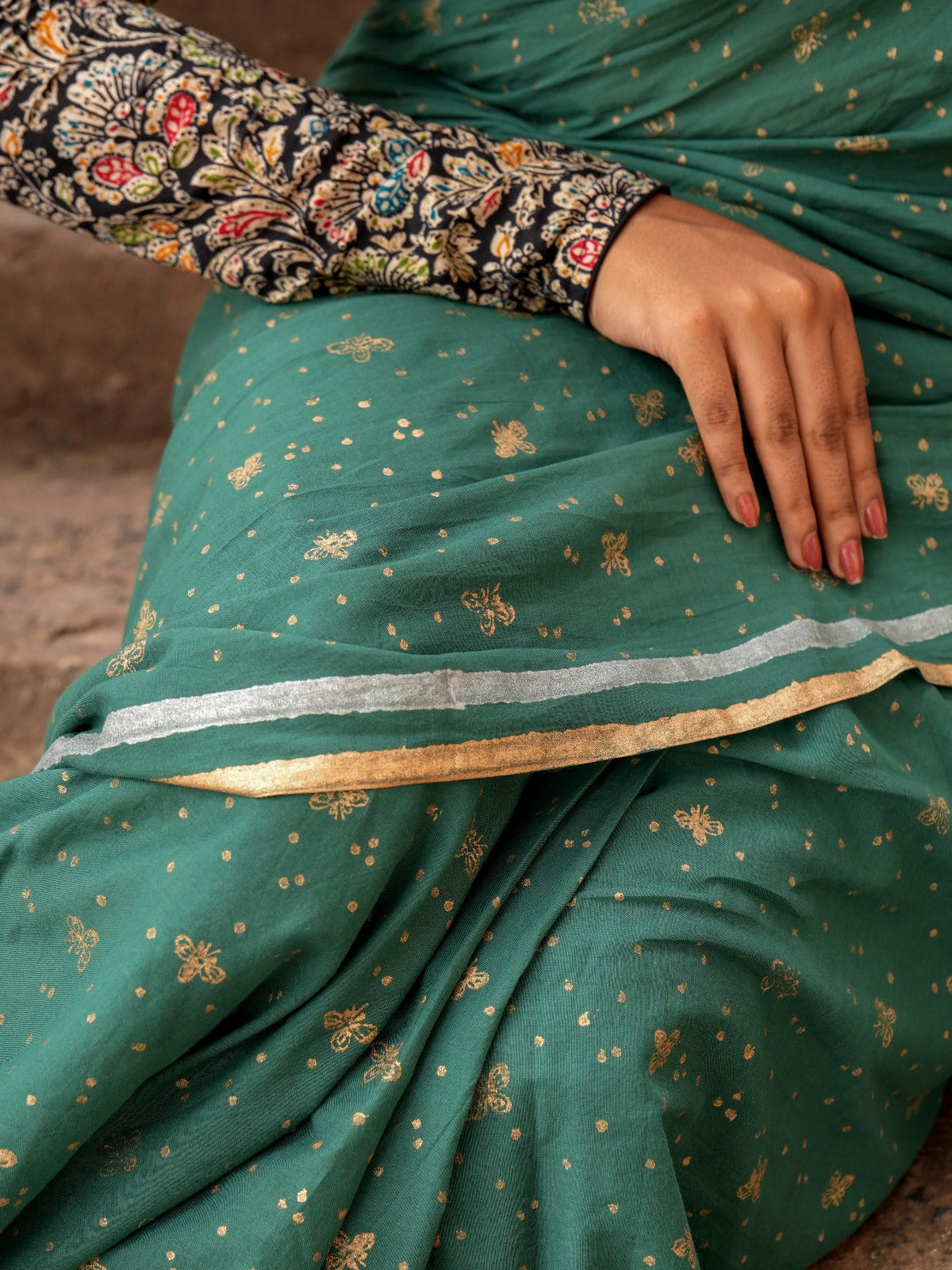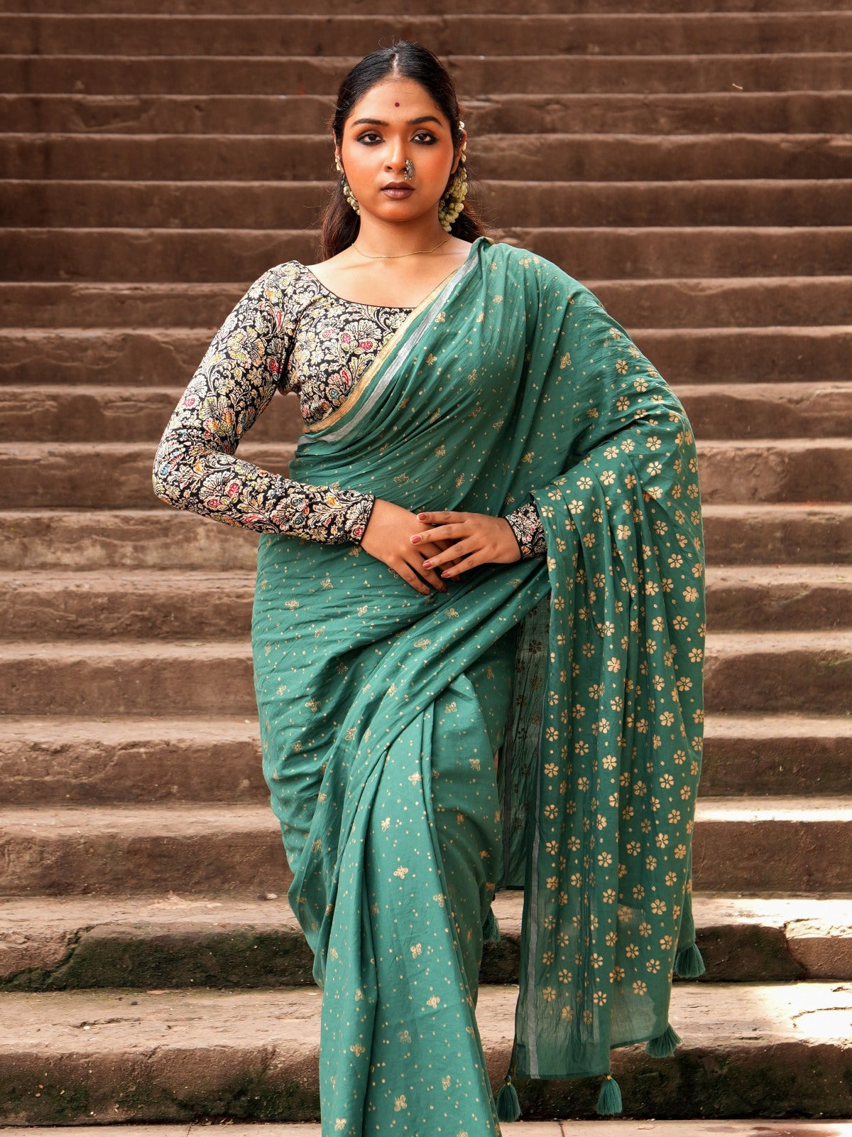 Say hello to Cazulo, a saree that brings the magic of Goa’s night sky to your wardrobe. Handcrafted with love, this dark green mul cotton saree is sprinkled with gold and silver foil motifs that shimmer just like fireflies do when they come alive under moonlight. The colour? Inspired by the deep greens of Goan trees, where these little glowing wonders love to play.