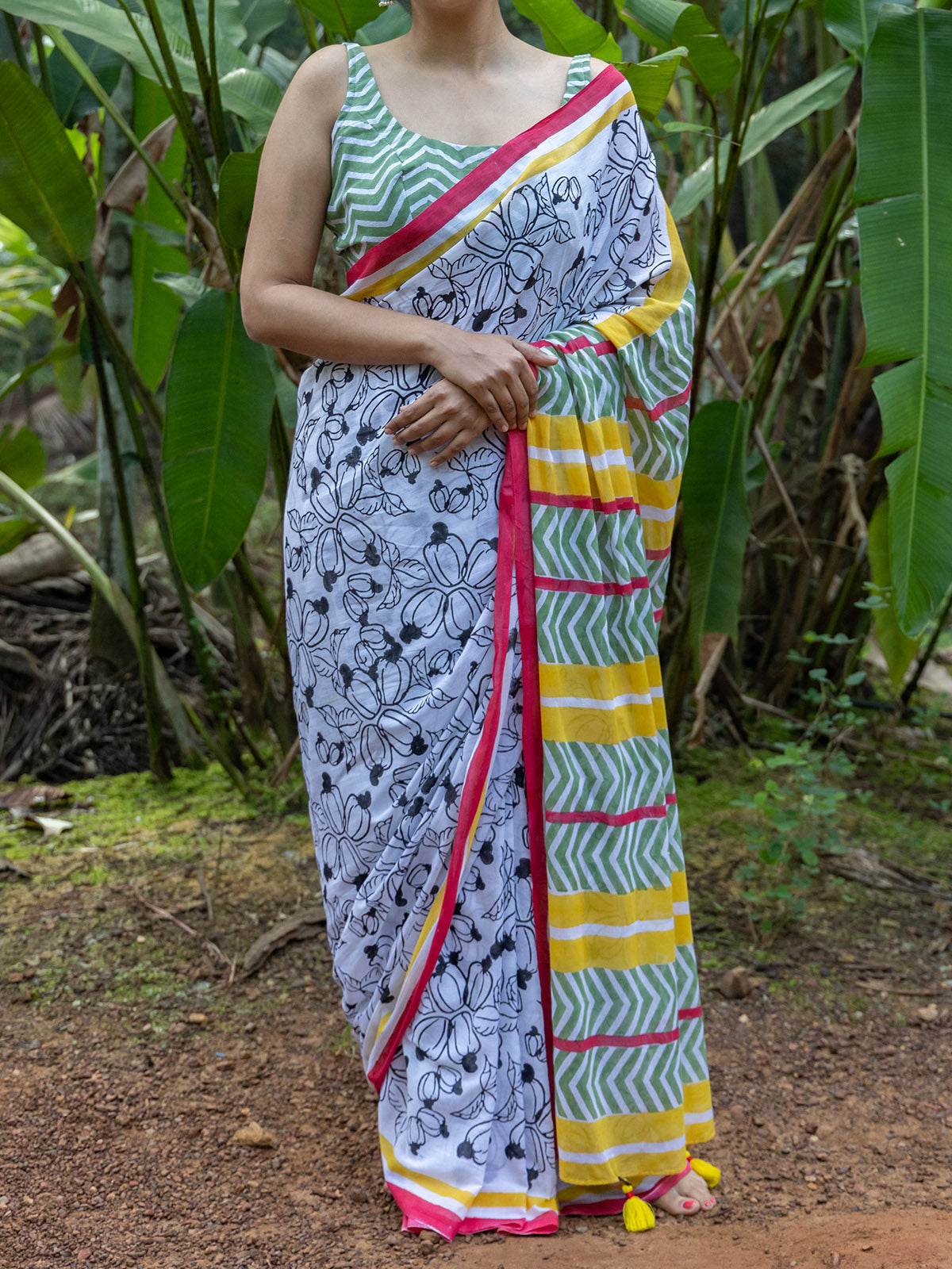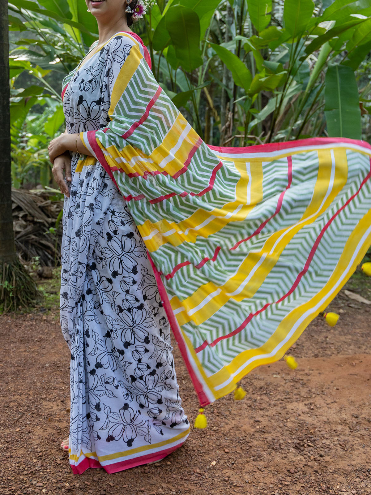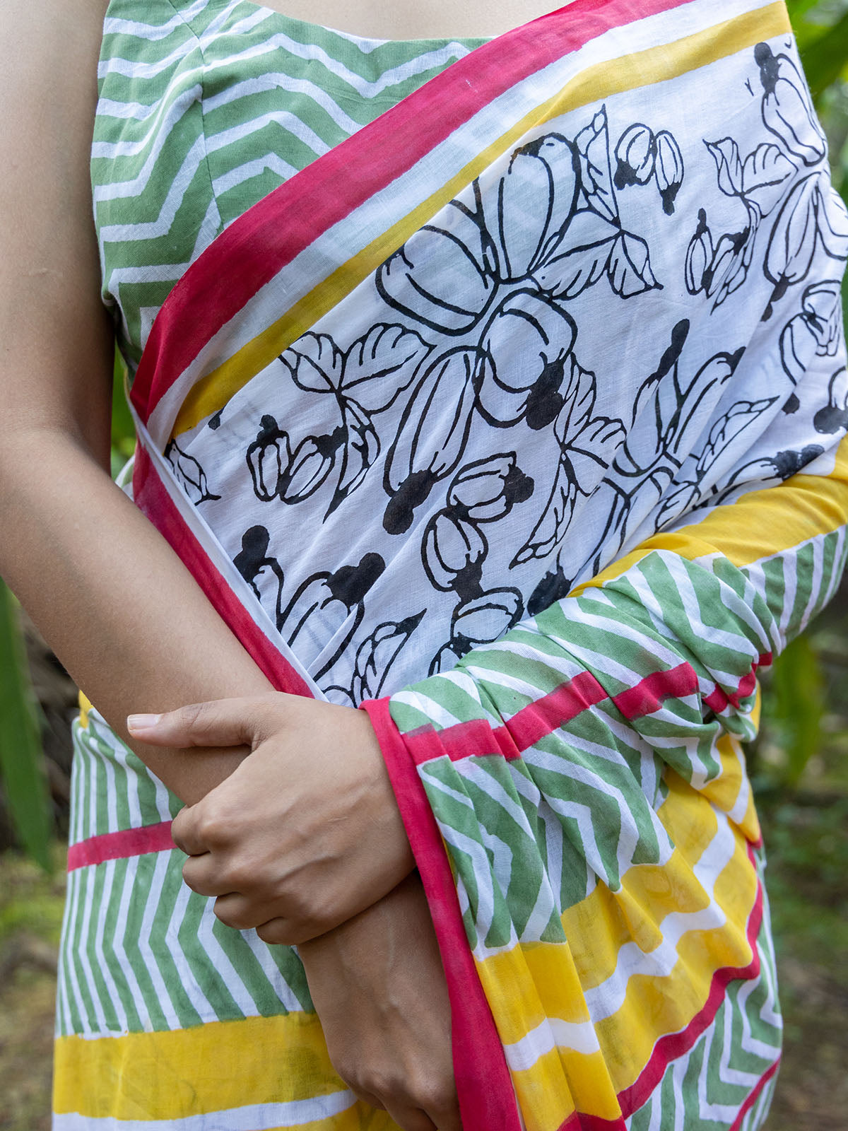 Embrace the essence of Goa with this Hand Block Printed Kajini Mul Cotton Saree in pristine white. Inspired by lush Cashew orchards, it features vibrant Cashew fruit prints on soft mul fabric. Crafted sustainably in India, each saree is hand-dyed and block printed by skilled artisans, ensuring unique, eco-friendly fashion.