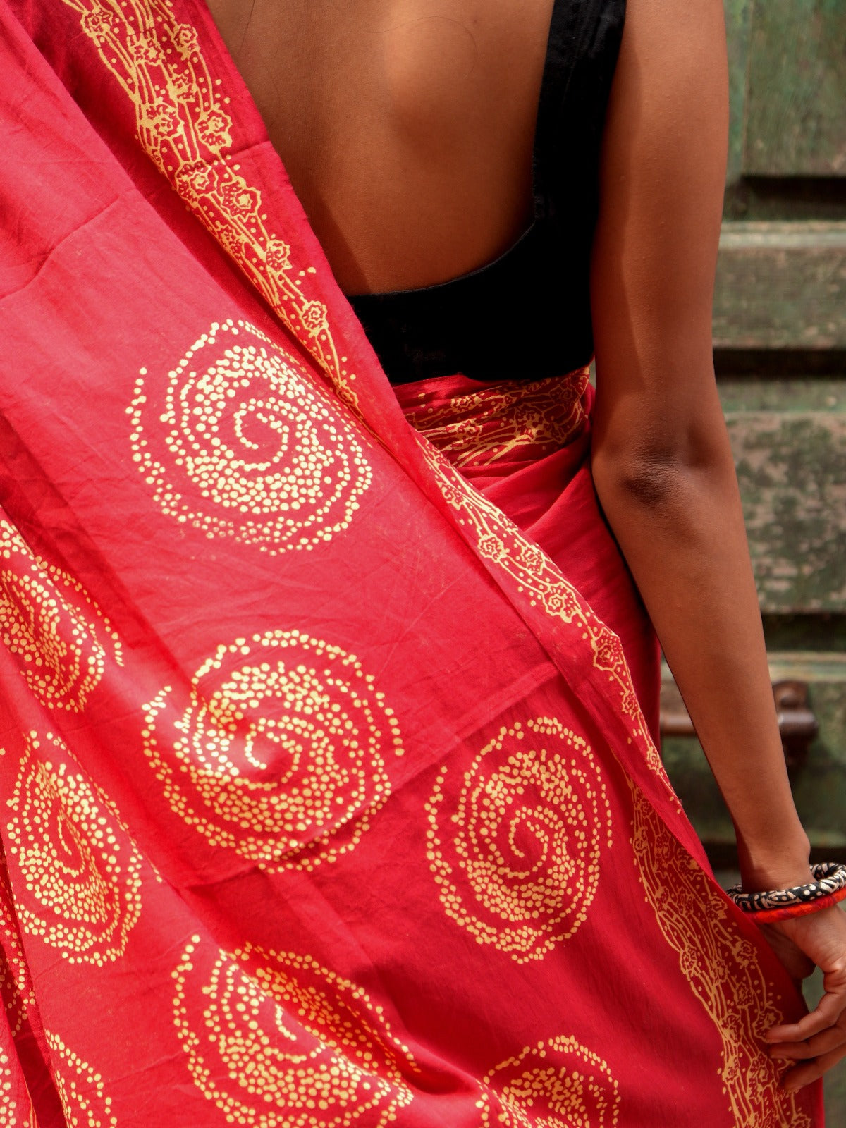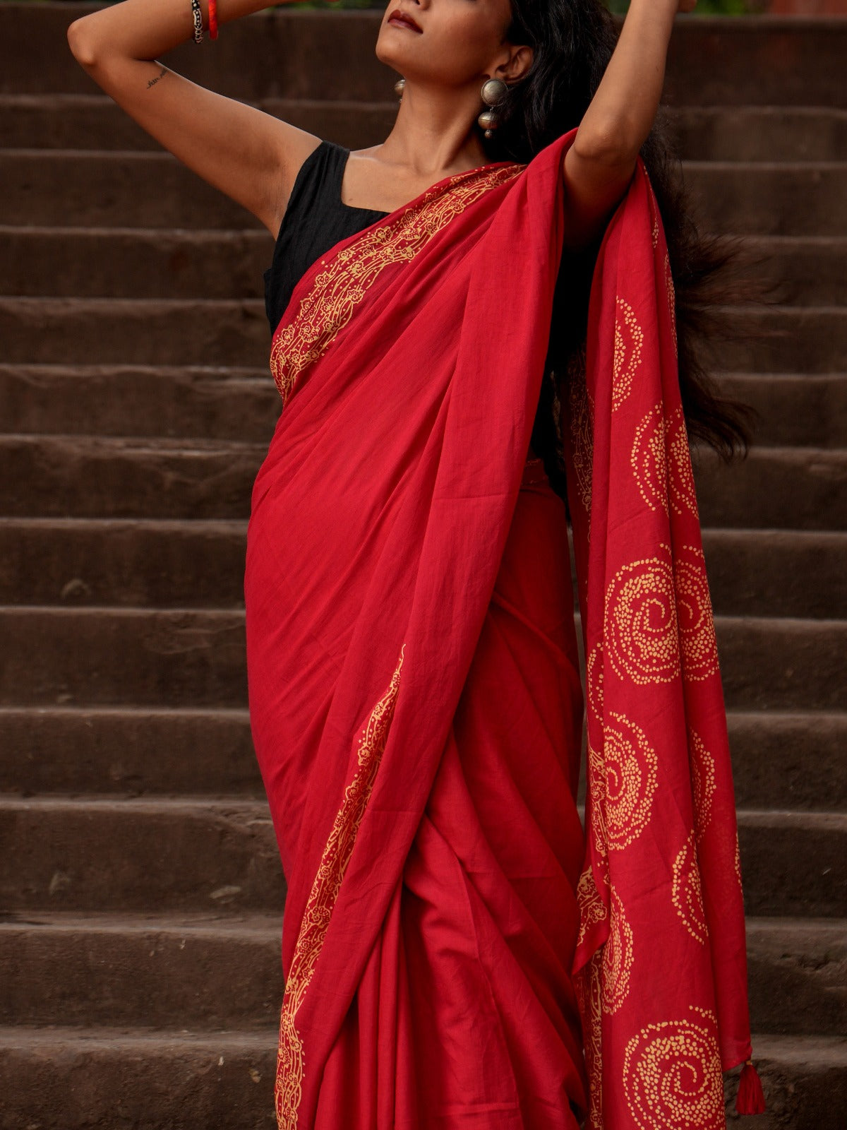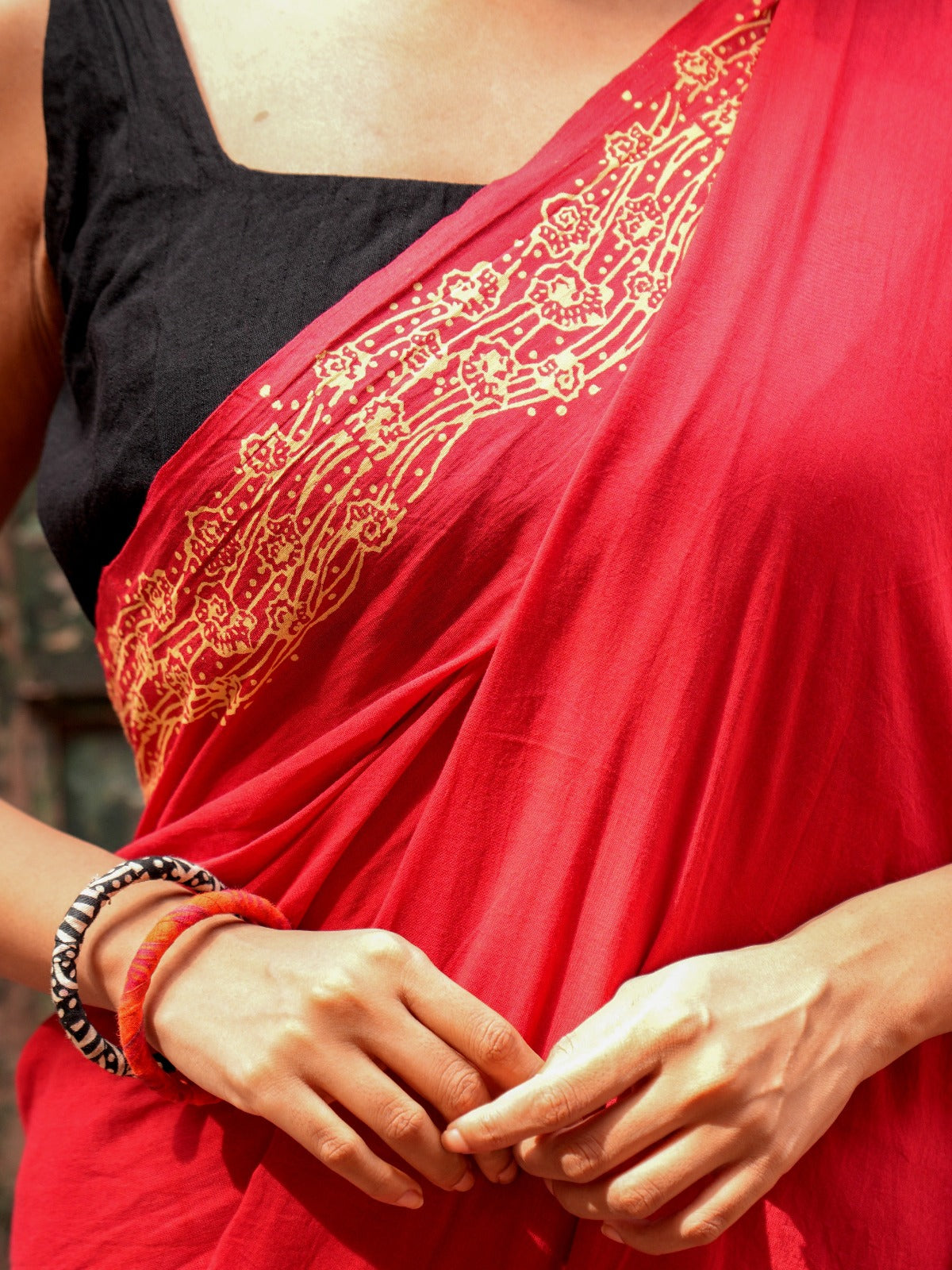 Inspired by the soft spirals of waves and the treasures they bring shells, seafoam, and silence Lhaar brings movement and calm together in one elegant drape. The maroon colour reminds you of the sky just after the sun dips, when reds and oranges linger, and everything feels slow and golden. Whether you’re dressing up for a festive evening, a beach wedding, or just want to carry a bit of the ocean with you this Goa-inspired saree is a whole mood. At Mogasu, apparel is hand-dyed and hand-blocked printed by skillful artisans with love and precision. You might notice some imperfections - a testimony to the 100% original hand-printing techniques. The colours might slightly differ due to lighting and photography.
