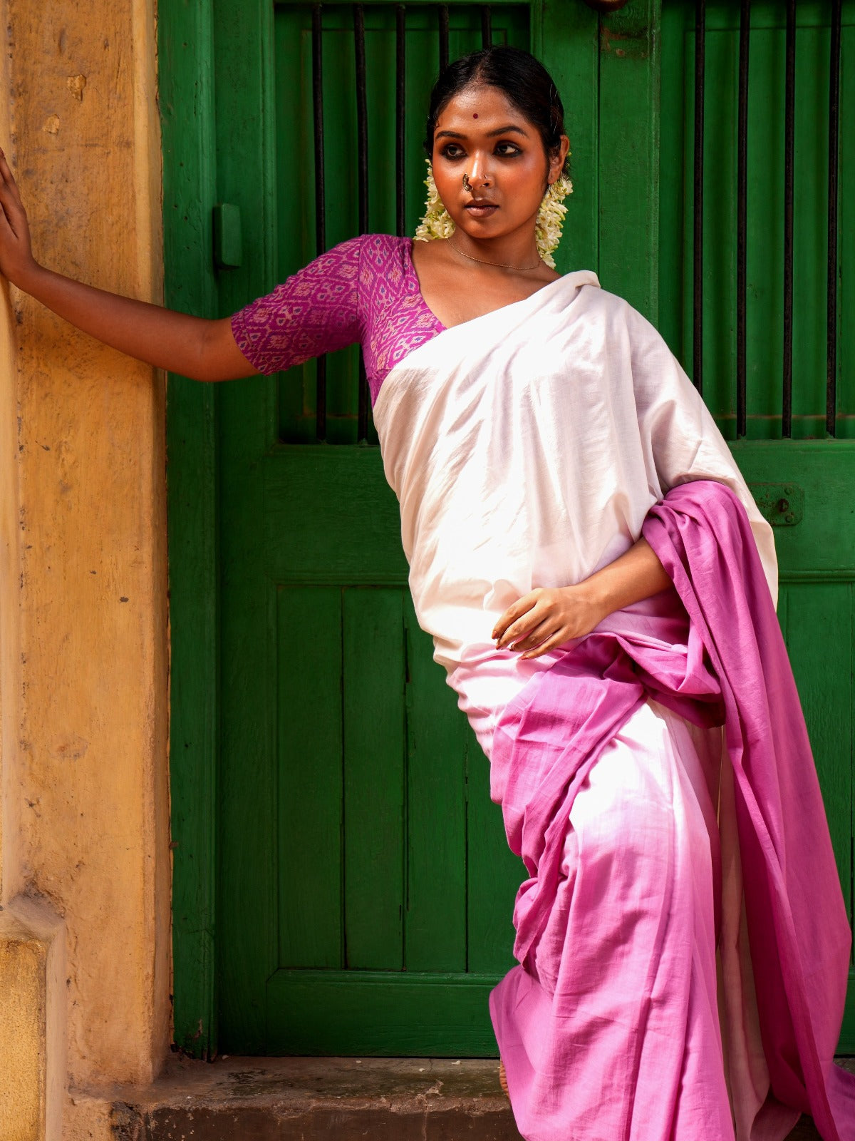 A delicate ombre saree that melts from shades of pink, just like the early light kissing the Goan coast. Inspired by the gentle aura of sunrise, this saree brings a calm, glowing softness to your wardrobe. It’s perfect for brunches, beachside mornings, or any day you want to carry a quiet kind of radiance with you