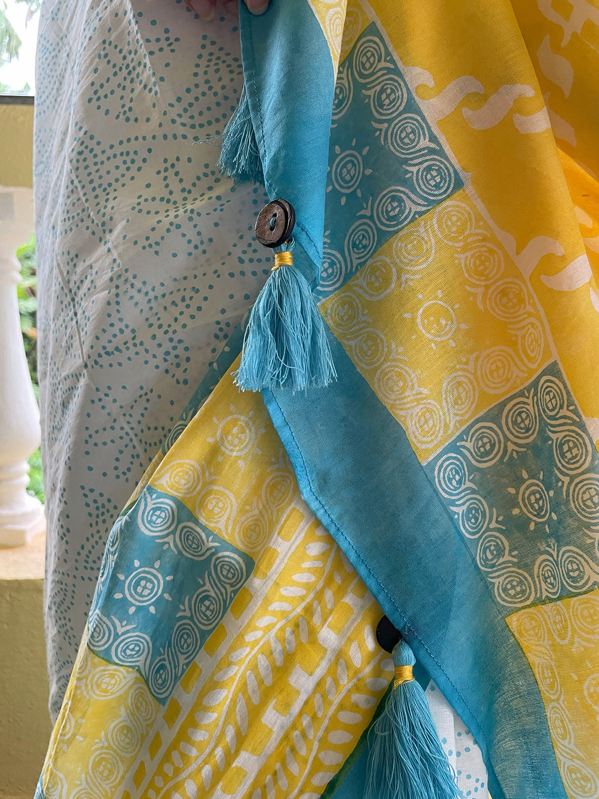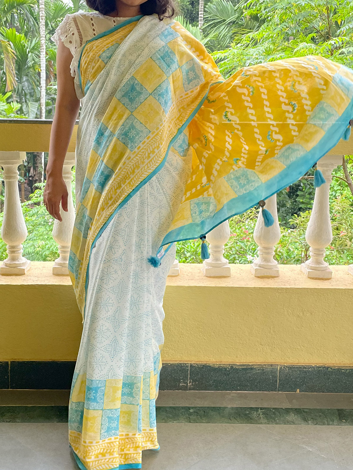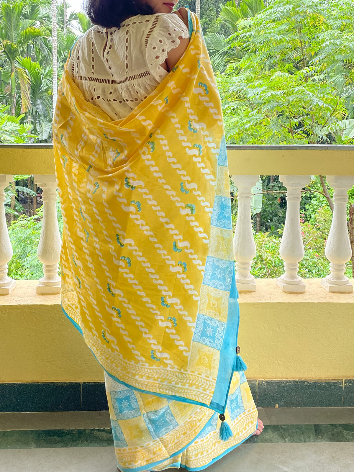 Elevate your style with this Hand Block Printed Quadro Blue Mul Cotton Saree, featuring intricate blue and yellow blocks inspired by Goa's Kaavi art. This border-centric design adds a unique charm to the saree. Crafted from soft mul cotton, adorned with contrasting tassels, and made in India, each piece reflects artisanal craftsmanship and sustainable practices.