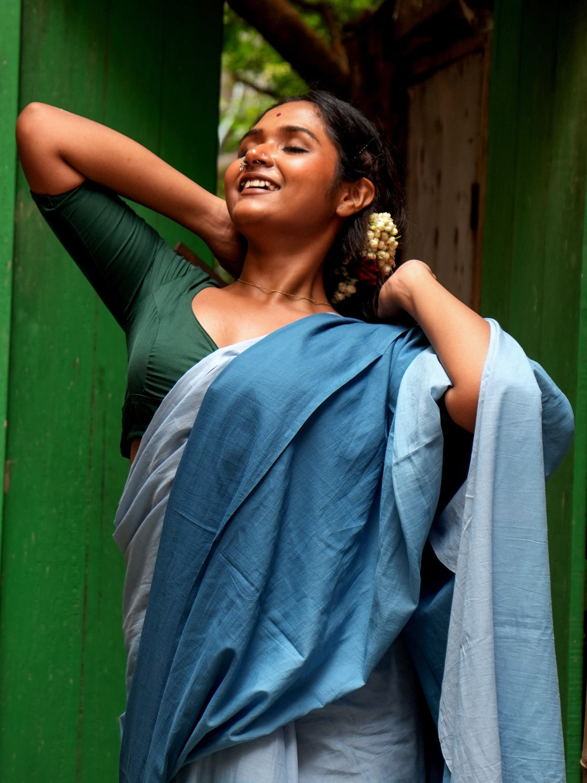 A dreamy ombre saree that flows from soft light blue to a deeper blue, just like the Goan sky as it slips into dusk. Inspired by that in-between magic when the sun has set but the light still lingers, Rati is all about quiet drama and evening charm. Perfect for sunset gatherings, twilight dinners, or when you want to wear a saree that feels like the last light of day.