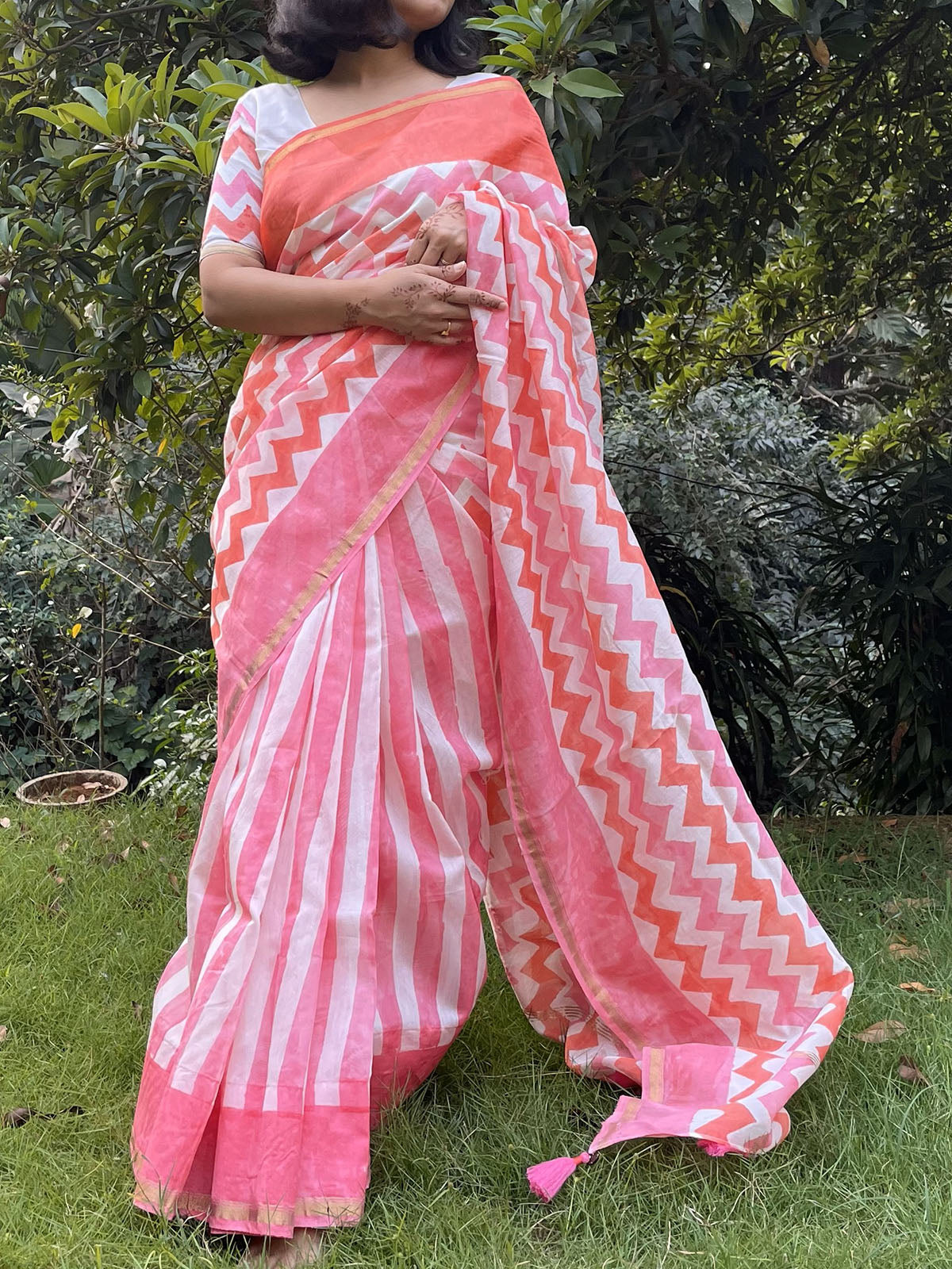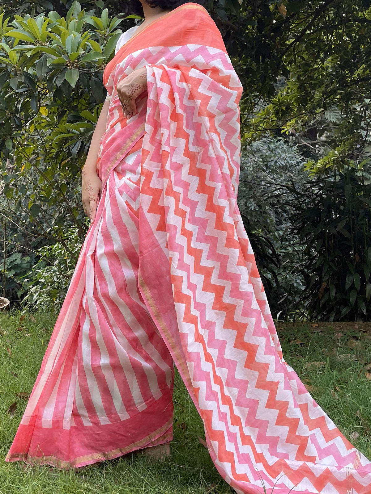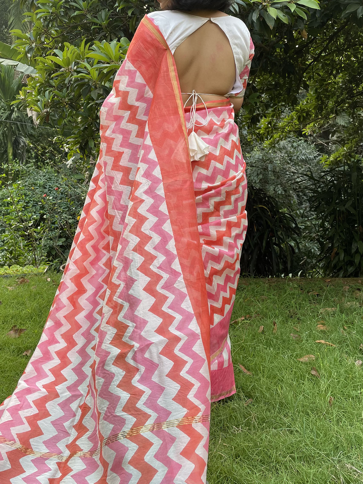 The rustic charm of the Hand Block Printed Sheem Orange Chanderi Saree. Inspired by natural fences and scenic staircases amidst lush greenery, Sheem features a unique border pattern. Crafted from premium Chanderi silk, known for its luxurious feel, saree is meticulously hand-dyed and hand-block printed by skilled artisans in India. This embodies the commitment to sustainable practices and preserves 100% original hand printing techniques.