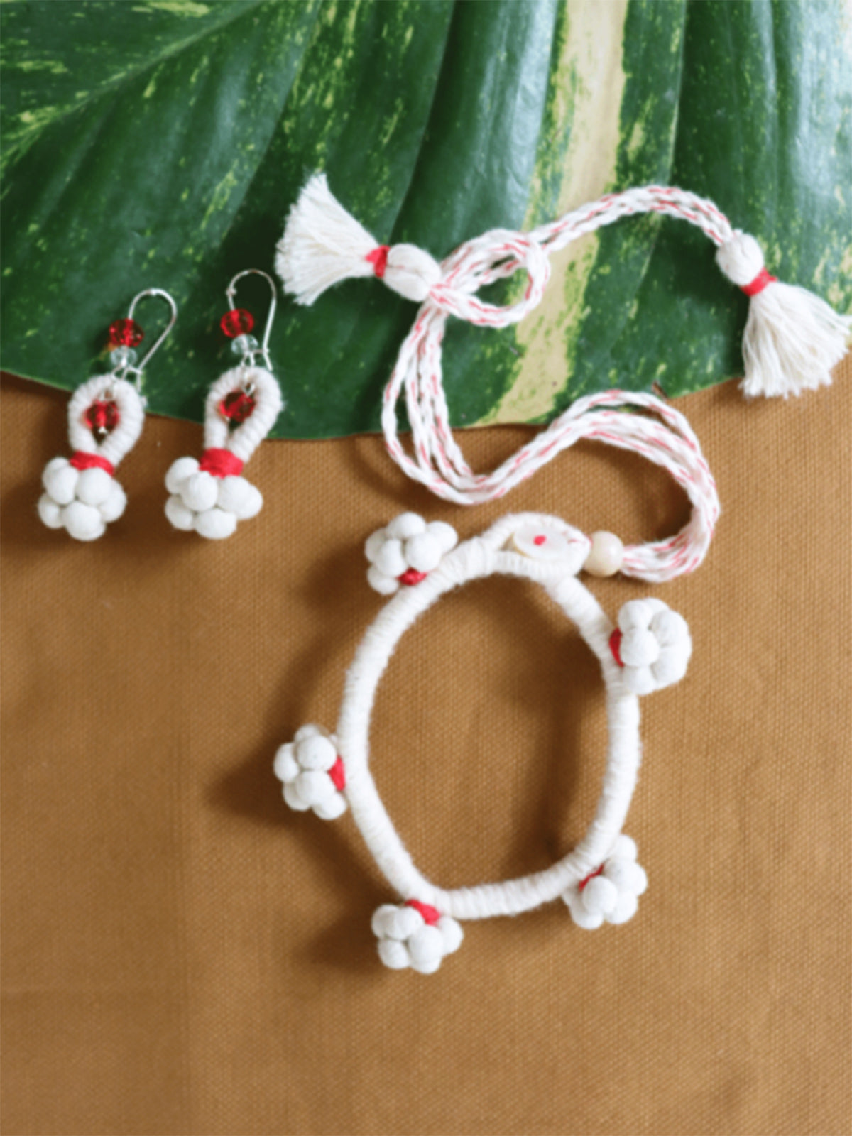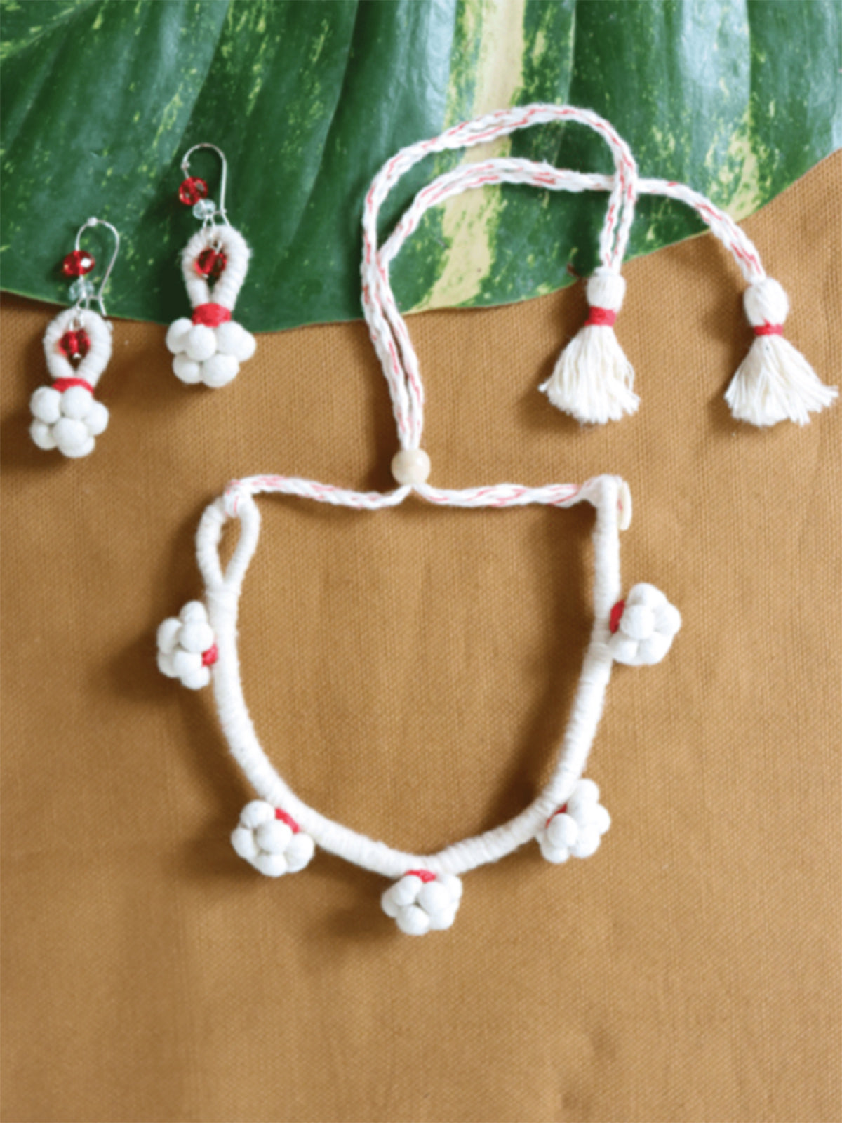MORALFIBRE boria work set. This set is made from khadi fibres boria clusters in delicate pattern the earing & necklace has glass beads & shell button. Colour red cream. Size:neck piece width 4.5 cm. Jhumki 4.5 cm colour - red, off white