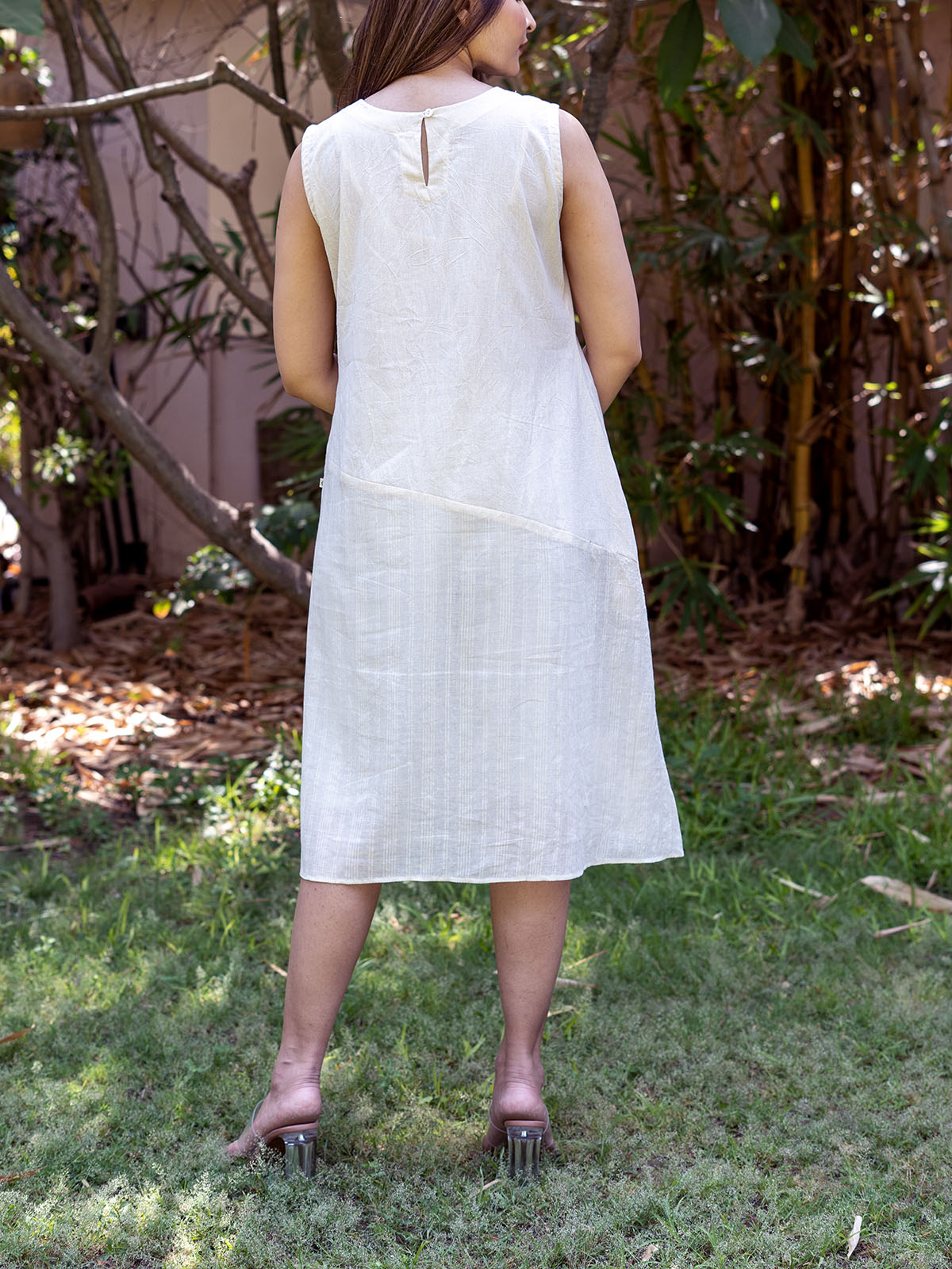 Introducing the Kora Sleeveless Dress With Diagonal Muslin Design. This sleeveless dress boasts a boat neck and a captivating diagonal pattern. Perfect for summer, it offers both versatility and comfort. Crafted from 100% natural cotton, it is handspun and handwoven, embodying eco-friendly, sustainable fashion.