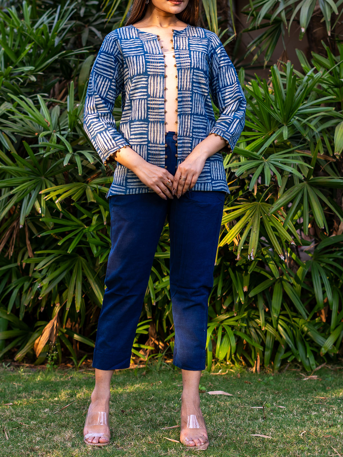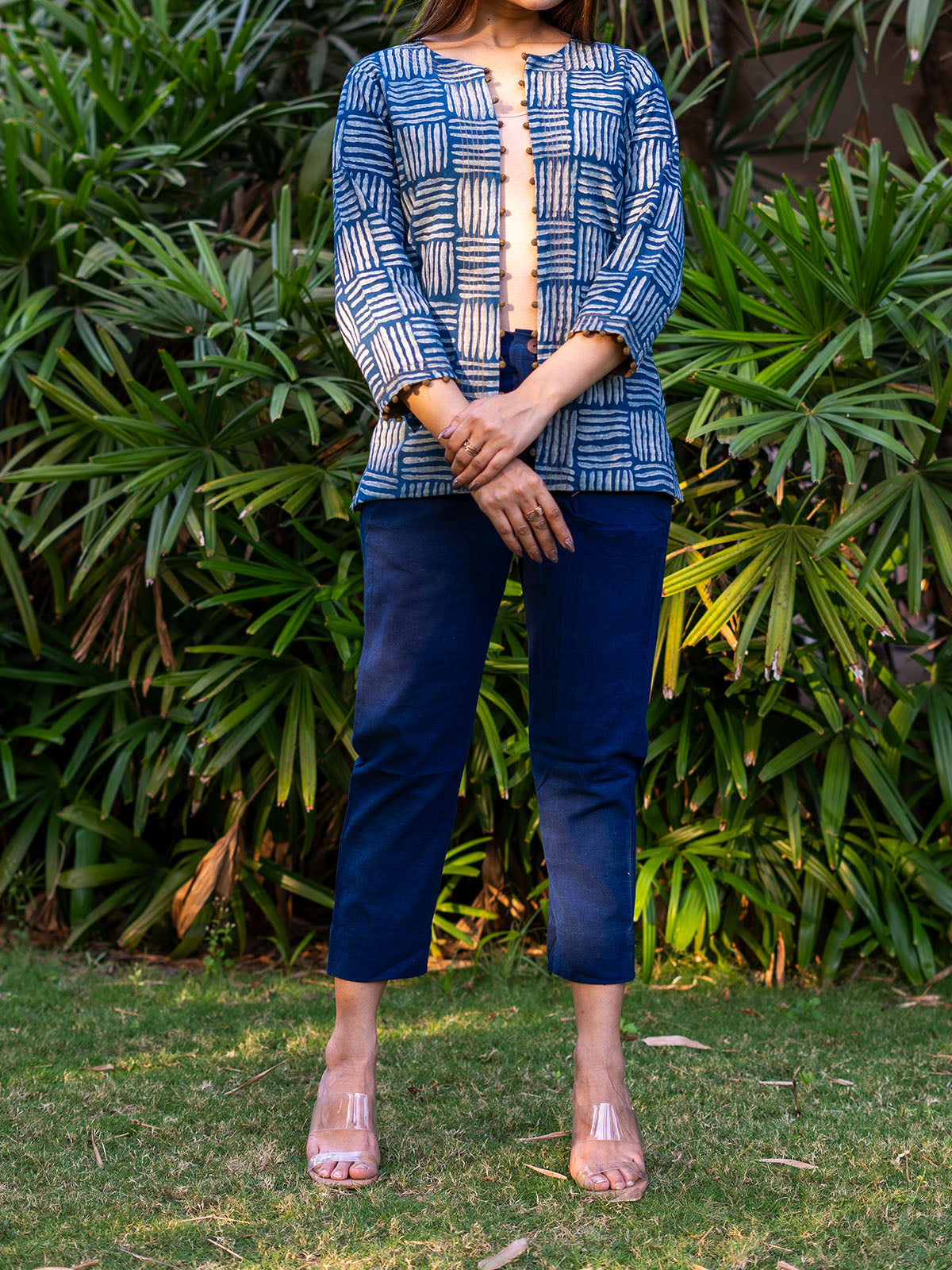 Introducing the Mango Design Handblock Print Indigo Jacket With Colorful Lining. This jacket showcases handblock printed natural Indigo, 3/4th sleeves, and a round neck. Lightweight and ideal for spring, summer, and autumn, it is crafted from 100% natural cotton, handspun and handwoven, providing a timeless, sustainable fashion statement.