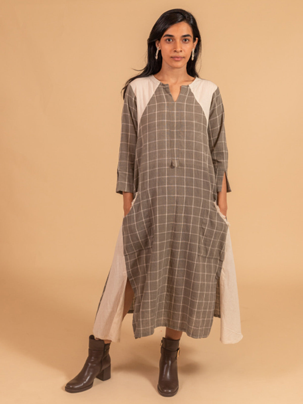 Moral Fibre Dress in kora and checks fabric features side kali from waist giving a tapered look . Frayed trim patch pocket & front slits gives easy movement . It can be worn as a dress or with cigarette pants