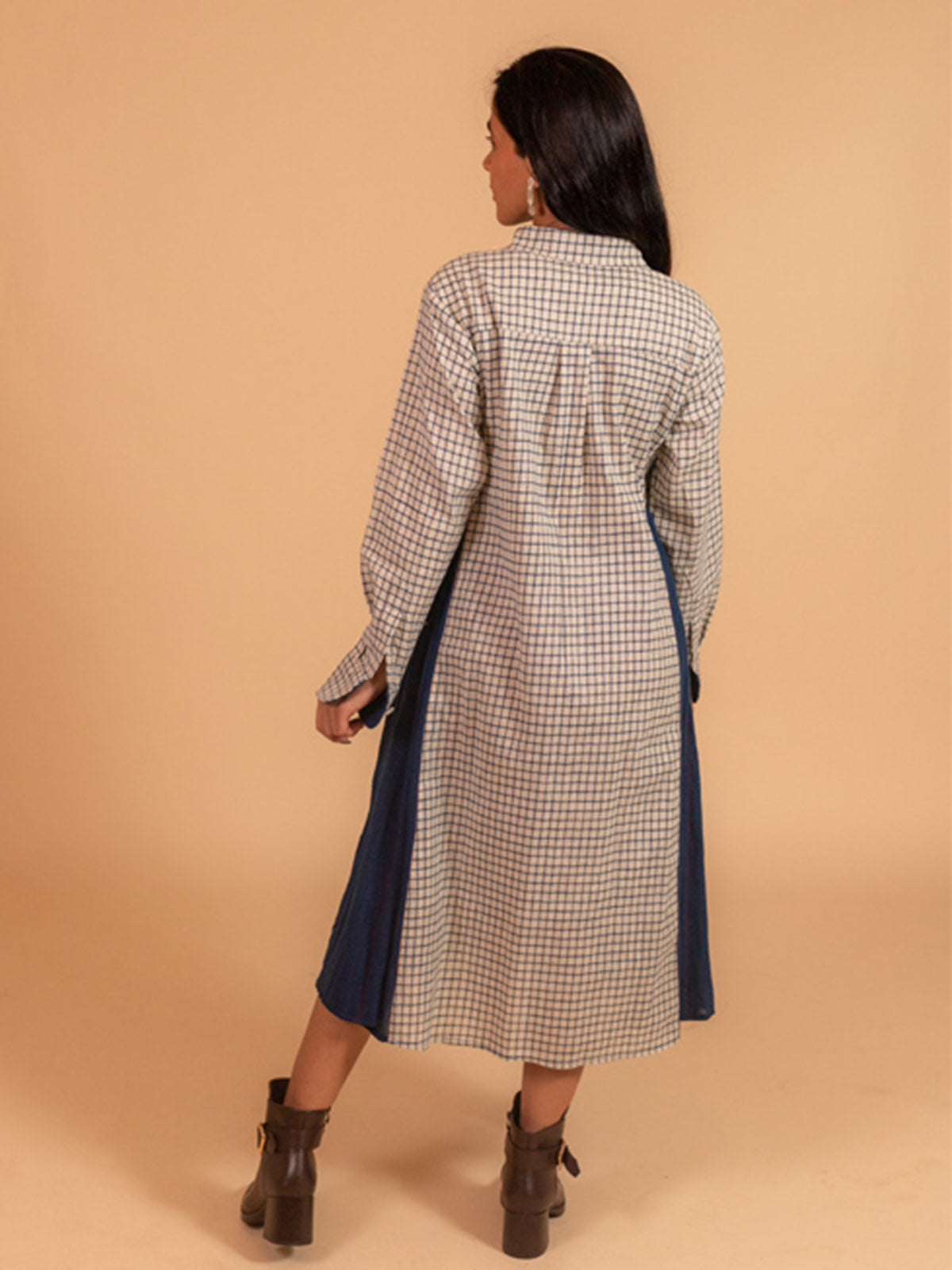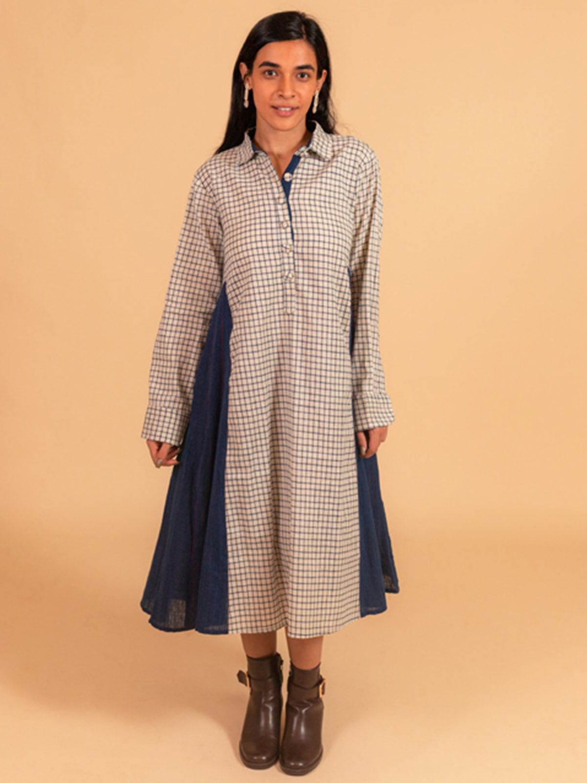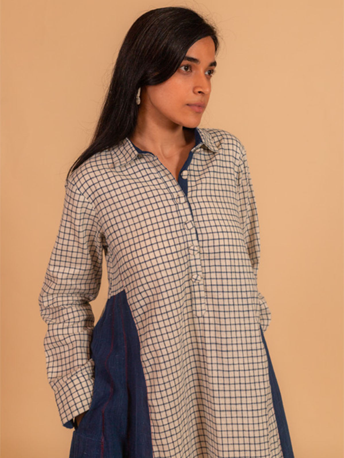 Moral Fibre side kali long shirt Indigo Dress features contrast color fagotting in all kalis. The solid color side kalis with checks front and back pannel gives tapering this easy breezy dress. It can be worn for travel/ holiday/ social gathering.