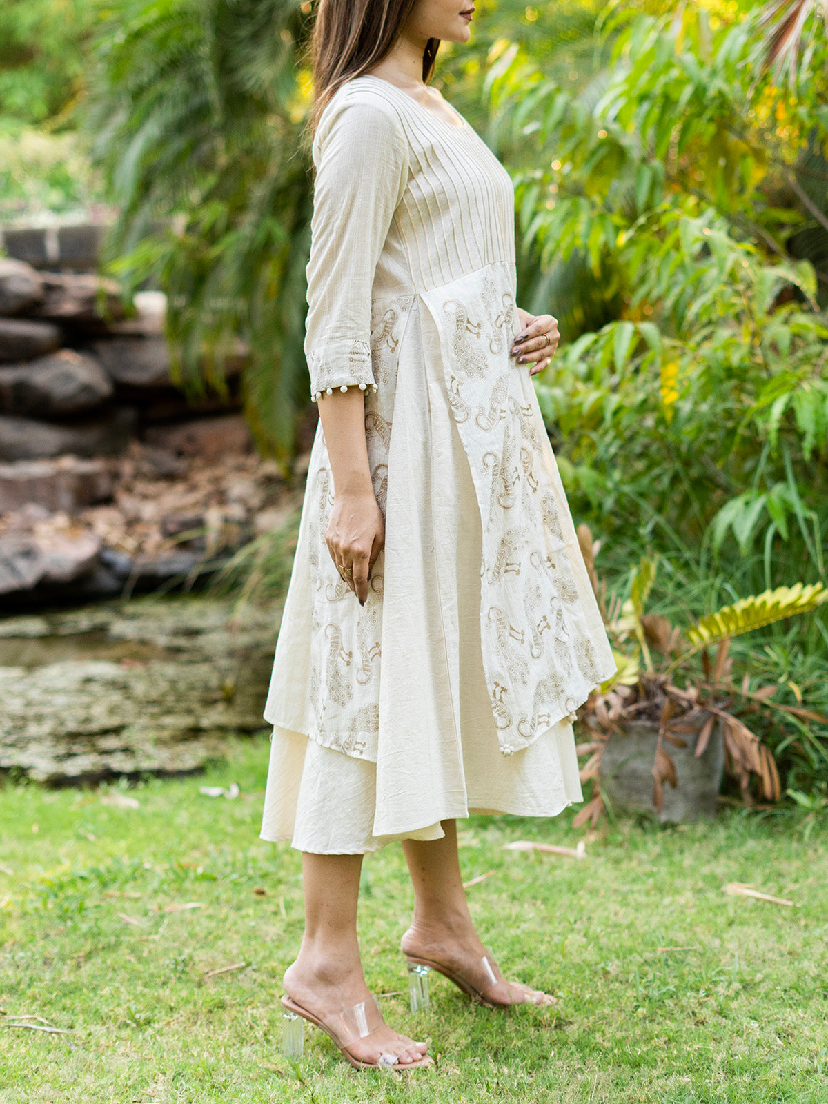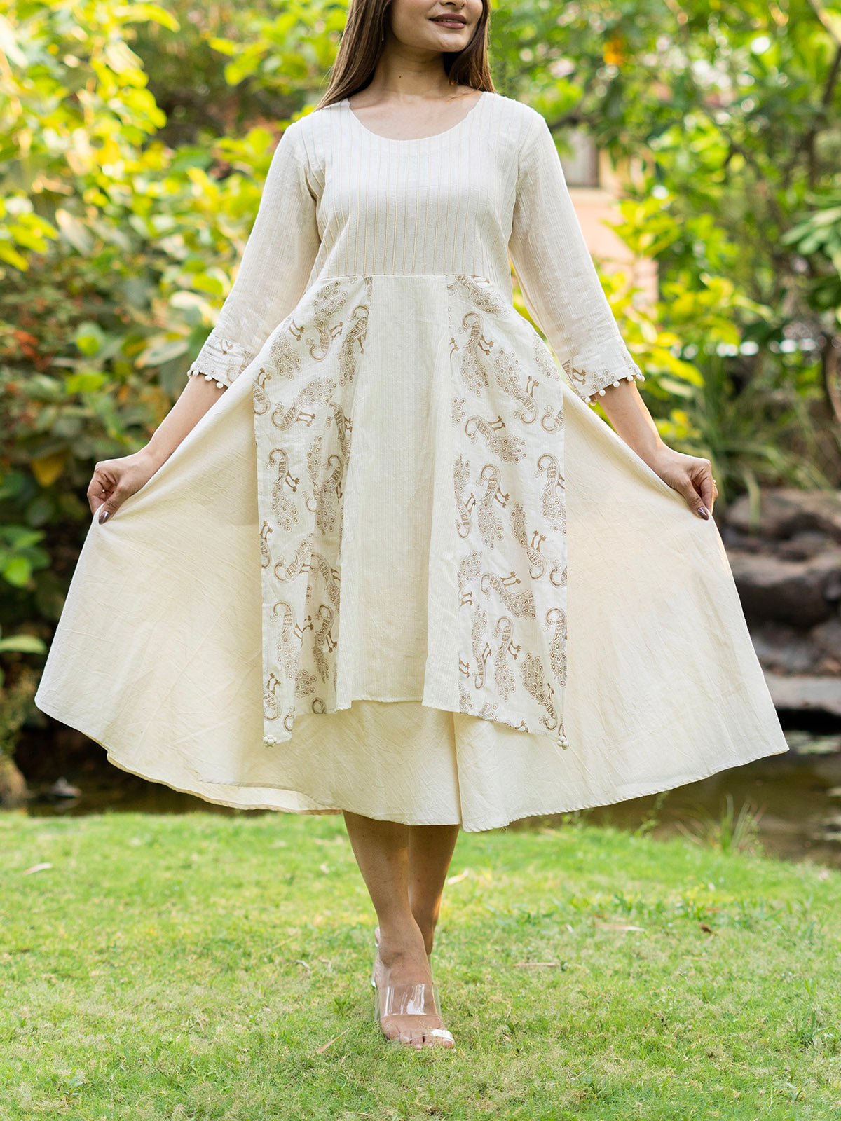 Introducing the Kora Dress with Golden Peacock Muslin Panels. This pintuck dress boasts a round neck, 3/4th sleeves, and stunning golden peacock accents alongside translucent panels. Perfect for festive occasions, this handspun and handwoven dress is crafted from 100% natural cotton, offering a blend of elegance, comfort, and sustainable fashion.