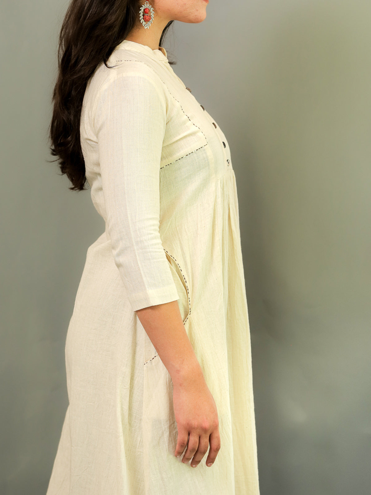 Radiate charm in the Pearl String Dress in Off-White. Featuring a stand collar neckline, shell buttons, and 3/4th sleeves, it exudes classic appeal. Delicate pearl and thread work around the shoulders and pockets elevate this dress for all occasions, embodying a commitment to sustainable fashion. Made in India.