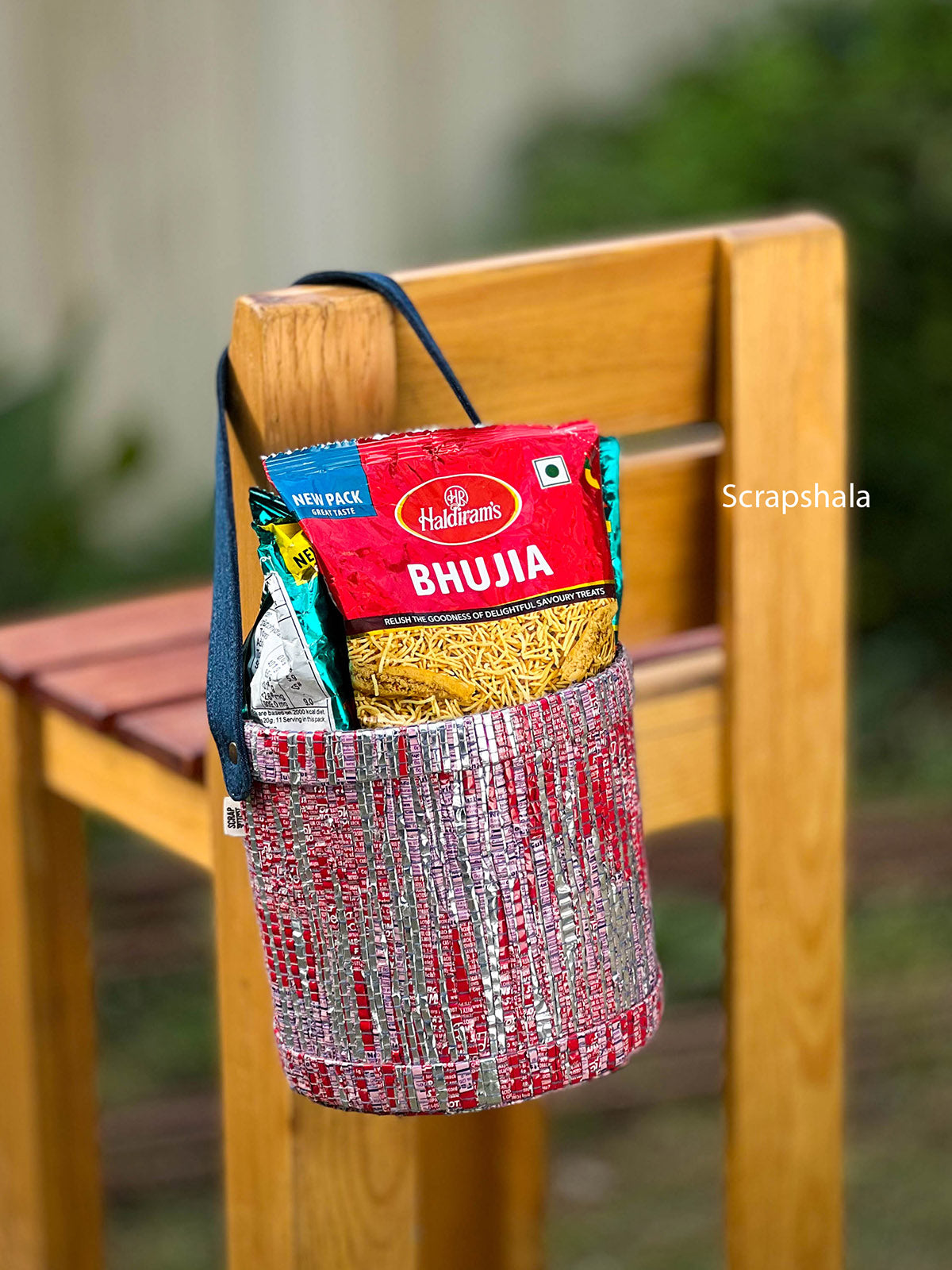 This product is handcrafted from textile hand-woven in a traditional handloom from single-use plastic wrappers (commonly referred as 'chamkila' in India) by local artisans.