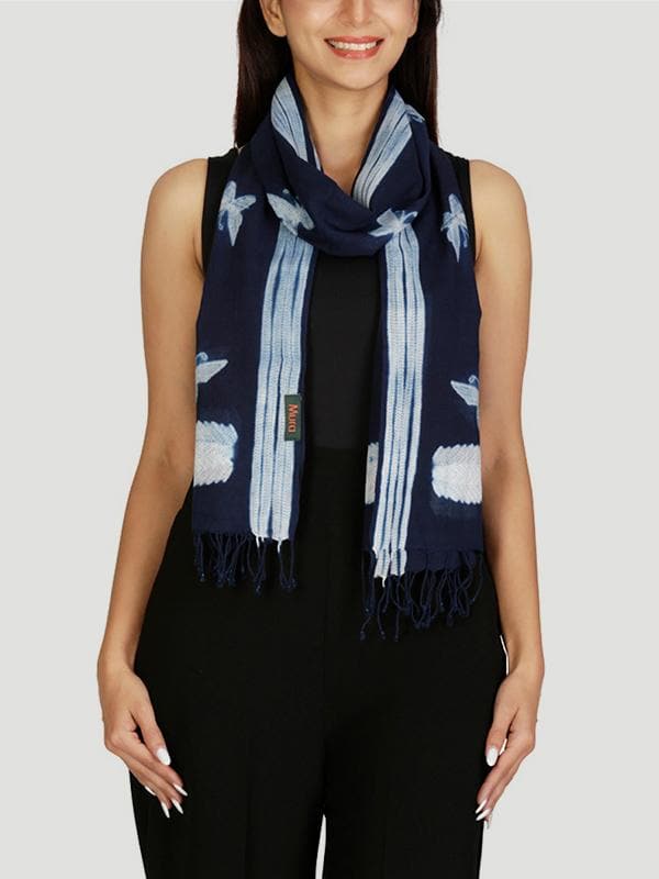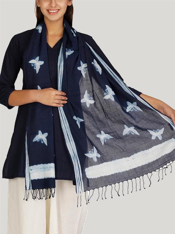 This is a sprightly and youthful indigo butterfly shibori pattern stole handwoven in pure cotton. It is crafted by artisans with shibori craft using natural dyes, particularly Indigo, on natural fibre fabrics. Shibori is a manual dyeing technique, which produces a number of different patterns on the fabric.