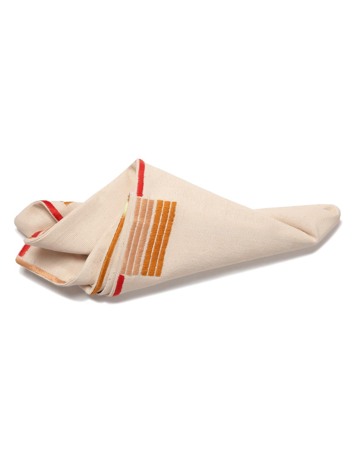 Elevate your dining experience with our Hand Embroidered Table Napkin, featuring a striking white square design adorned with vibrant orange and red stripes. Each napkin is meticulously crafted by skilled artisans, ensuring a unique touch that adds elegance to any table setting. Perfect for both casual meals and formal gatherings, this napkin not only enhances your decor but also provides a soft, absorbent surface for your dining needs. Make a statement at your next dinner party with this exquisite piece that combines functionality with artistic flair.