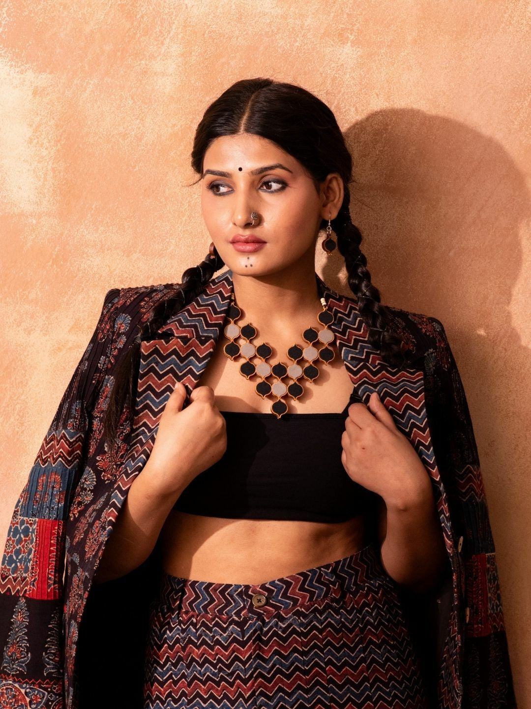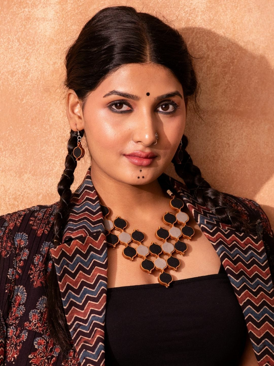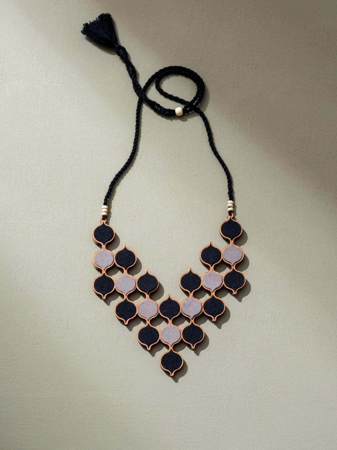 Elevate your style sustainably with the Wood Adjustable Length Necklace In Shades of Black. Crafted from repurposed fabric and compressed wood dust, a byproduct of furniture production, it reflects the commitment to sustainability. Sourced from garment cutting waste, this collection offers both style and a meaningful contribution to a greener future.