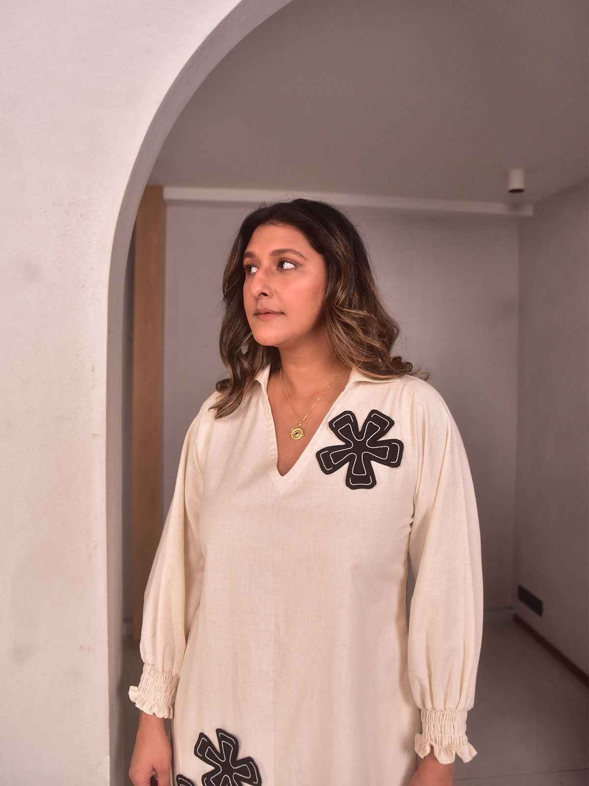 Cut in soft cotton linen, this A-line short dress features a V-neckline with collar, full sleeves with smocked cuffs, and delicate double floral appliques. Perfect for city sightseeing or brunch on vacation, it blends comfort with artistry. Style it with tan flats and a woven tote for a relaxed, elegant look.