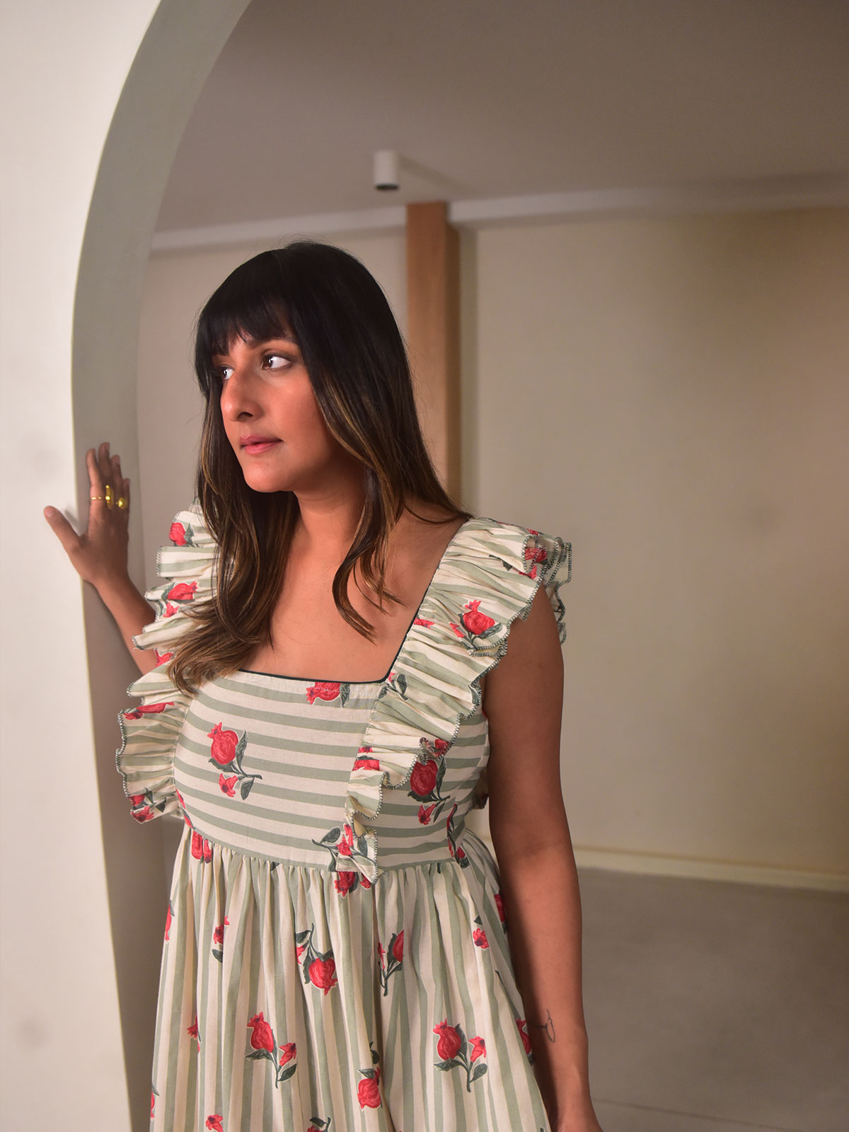 This breezy midi dress is cut in our exclusive green stripes printed cotton, designed to feel light and feminine. Featuring ruffle detailing on the front and back yoke, a square neckline, side pockets, and a back zipper, its both functional and elegant. The vertical stripes add an elongated effect to the silhouette. Ideal for brunches, daytime celebrations, or summer outings, style with delicate sandals and soft accessories.