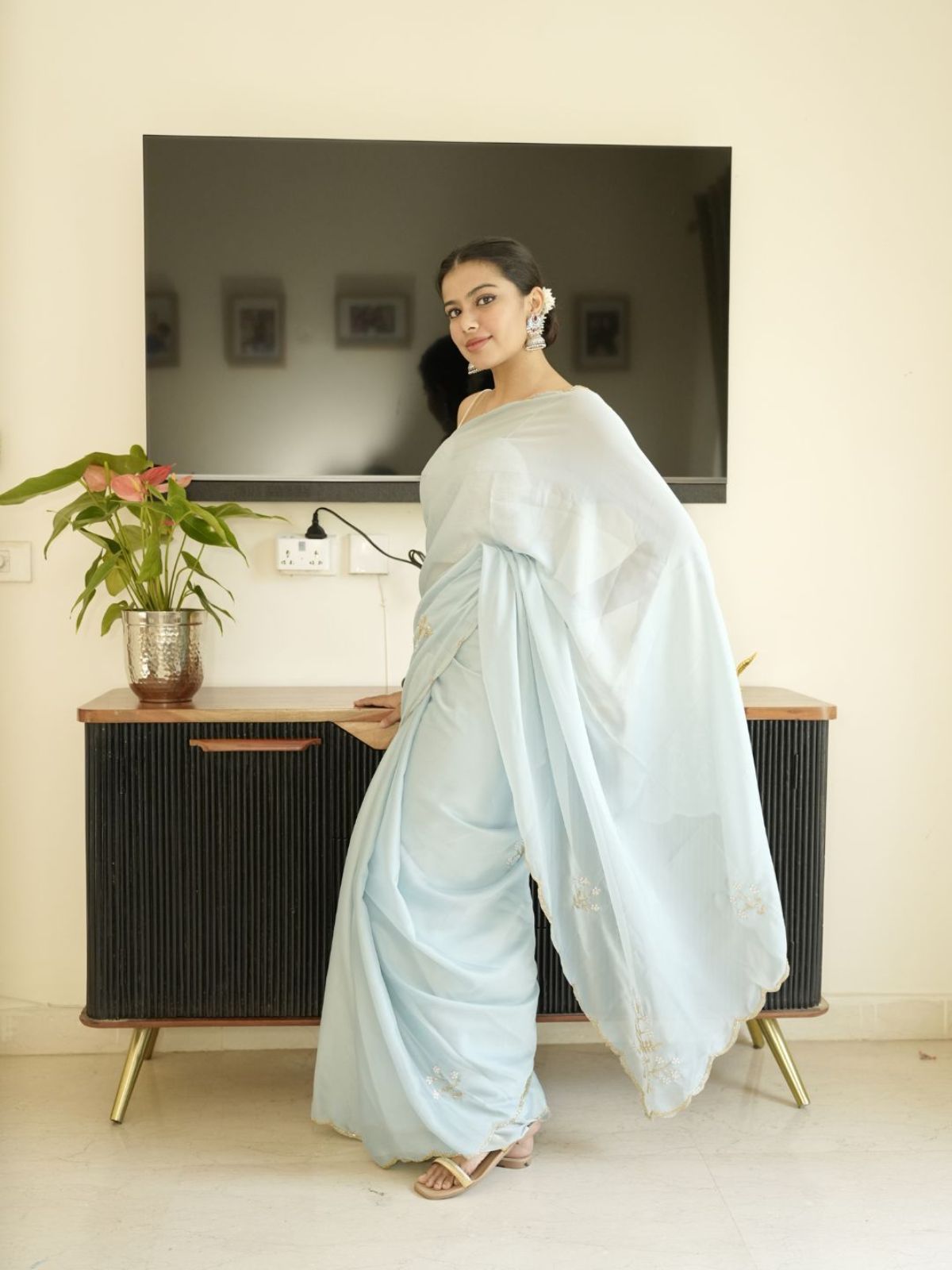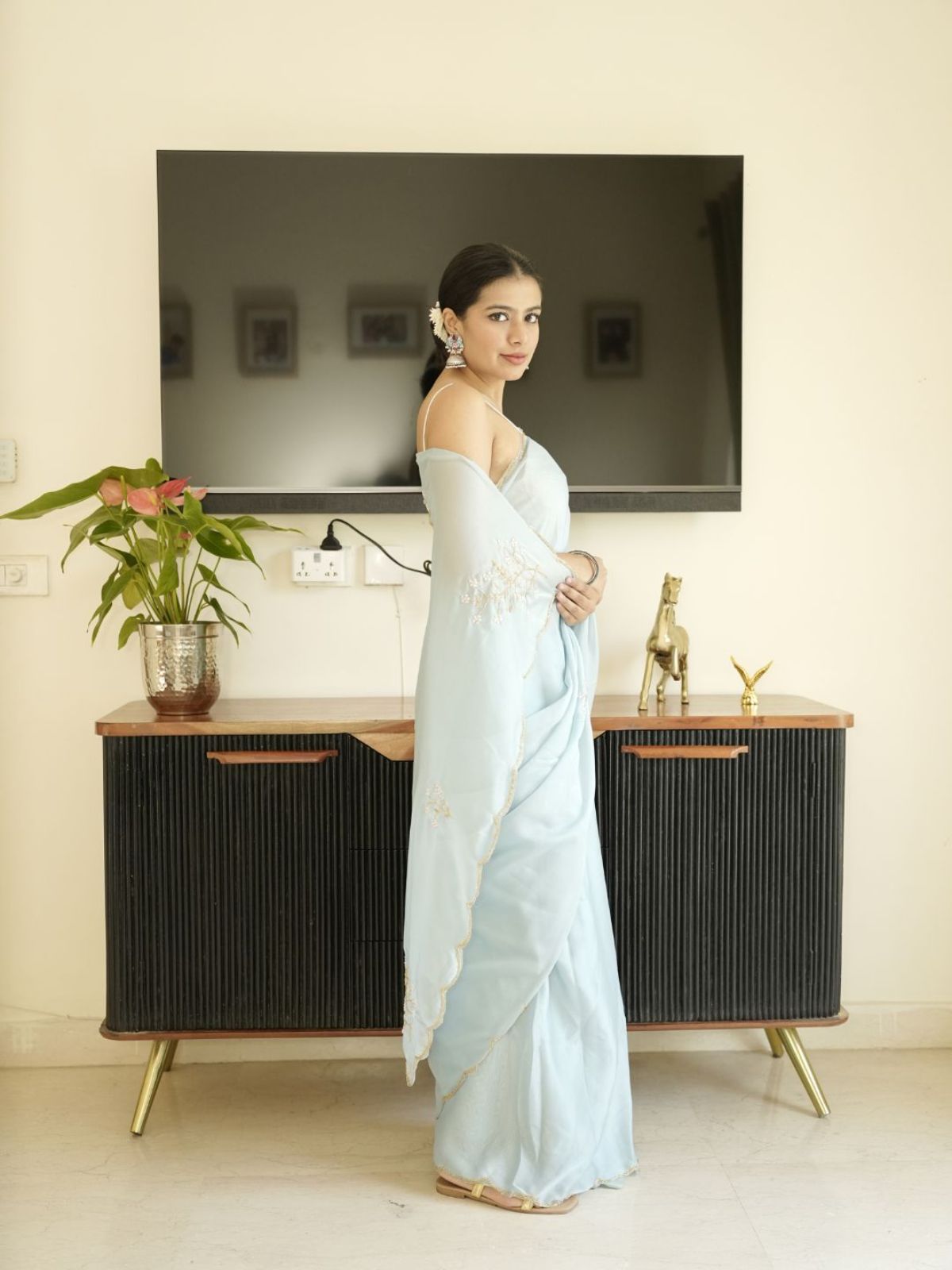 Elevate your ethnic wardrobe with this stunning blue georgette saree, meticulously crafted with intricate hand zardosi embroidery that catches light beautifully. The lightweight georgette fabric drapes elegantly, offering comfort without compromising on sophistication. Paired with a coordinating navy velvet blouse piece, this ensemble delivers a striking contrast that exudes luxury and refinement. Perfect for weddings, festive celebrations, or special occasions where you want to make a lasting impression. The combination of traditional craftsmanship and premium materials ensures this saree becomes a treasured addition to your collection.