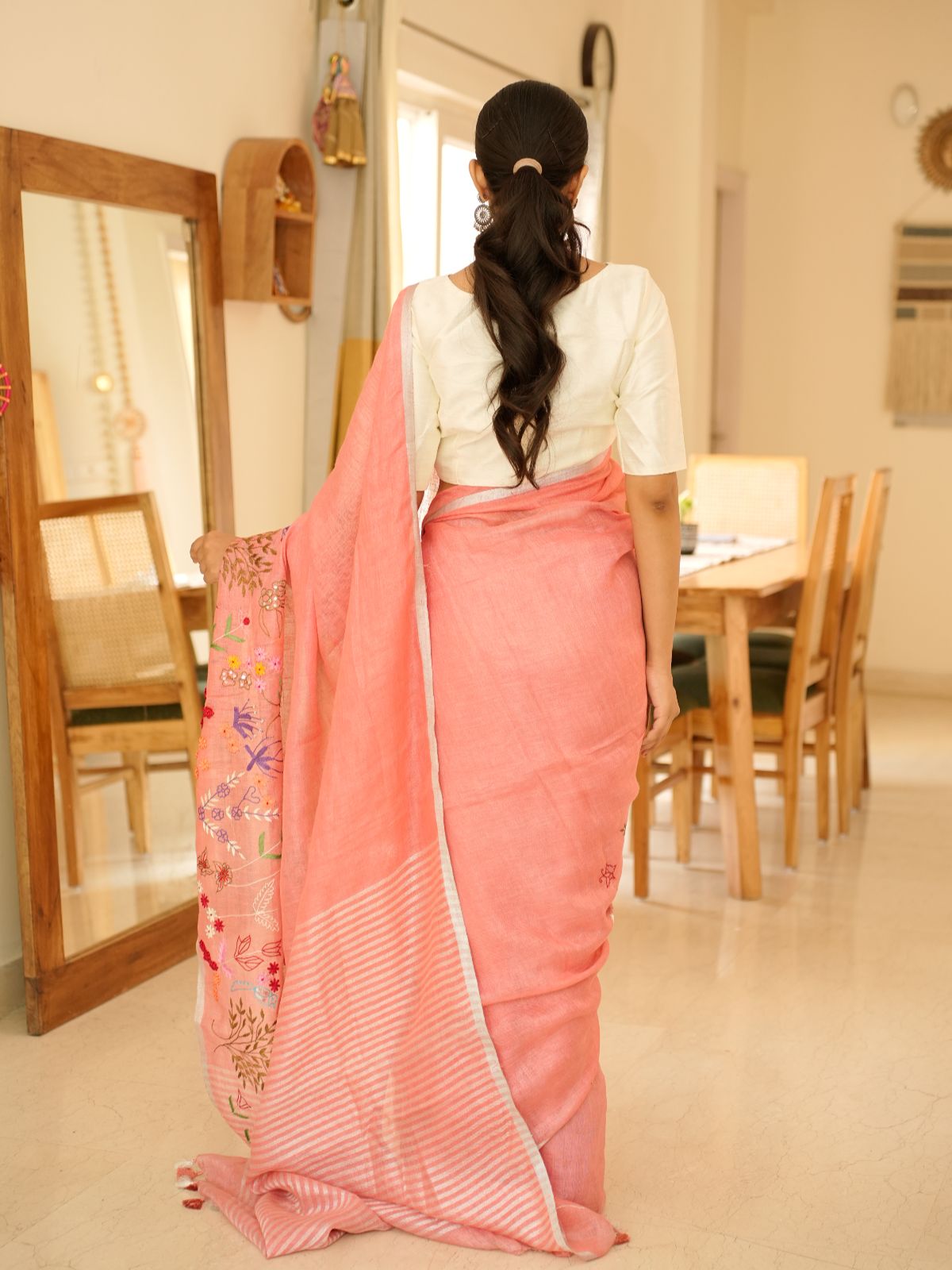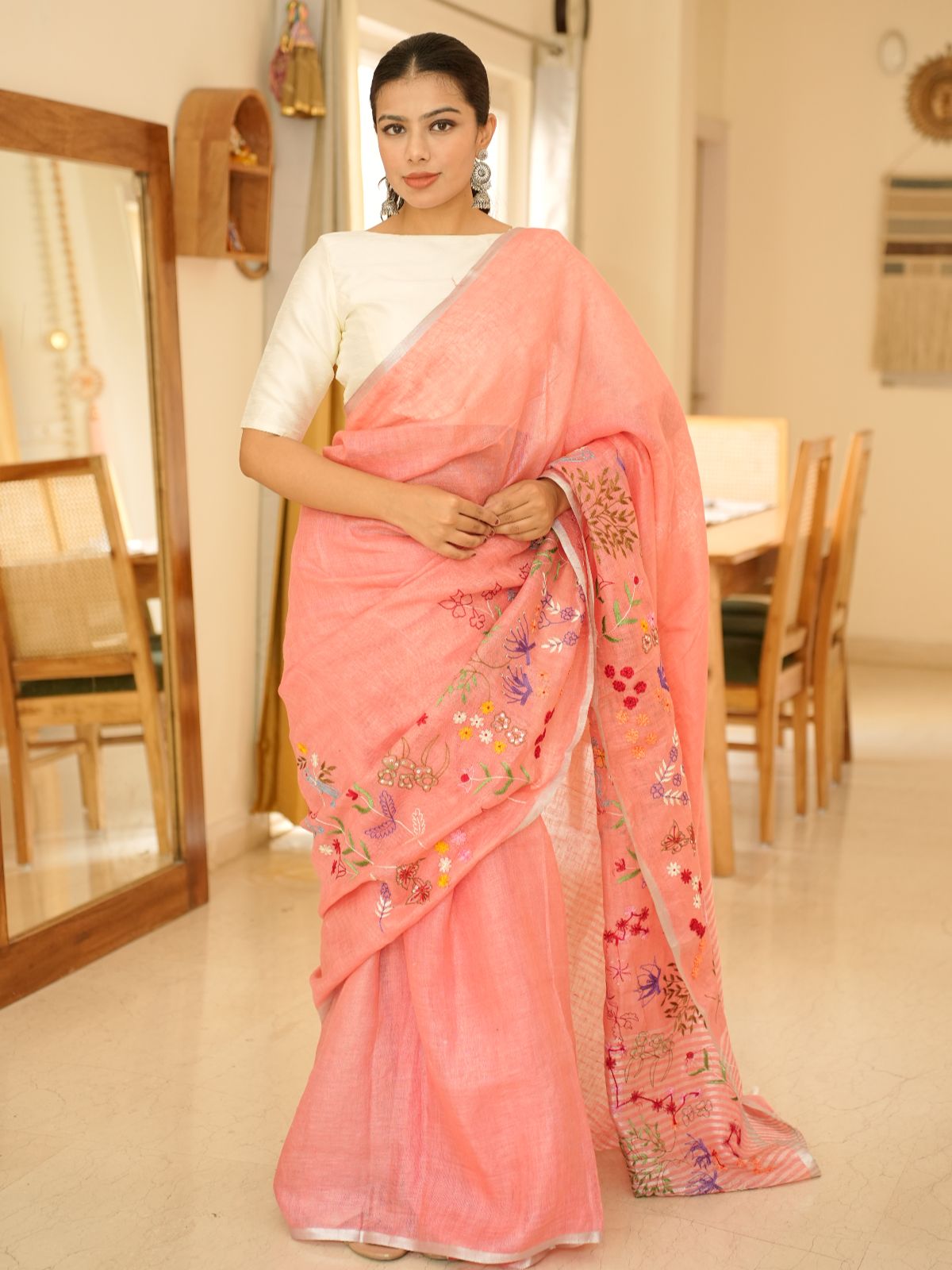 Discover timeless elegance with this handwoven pink linen saree, crafted to elevate your traditional wardrobe. The fabric's natural linen texture offers breathable comfort, while delicate floral embroidery adorns the piece with refined sophistication. Perfect for festive occasions or everyday wear, this saree balances understated beauty with expert craftsmanship. The subtle embellishments enhance rather than overwhelm, making it an versatile choice for those who appreciate quality and grace in their ethnic wear.