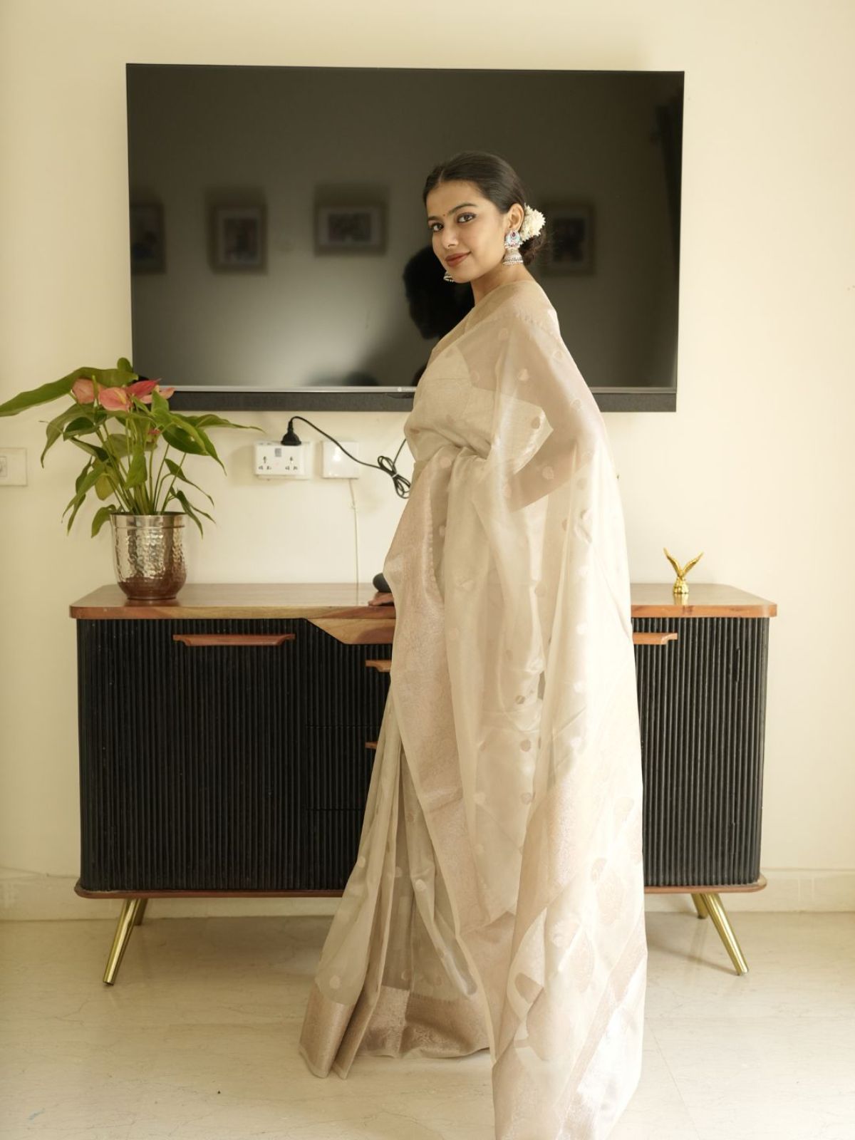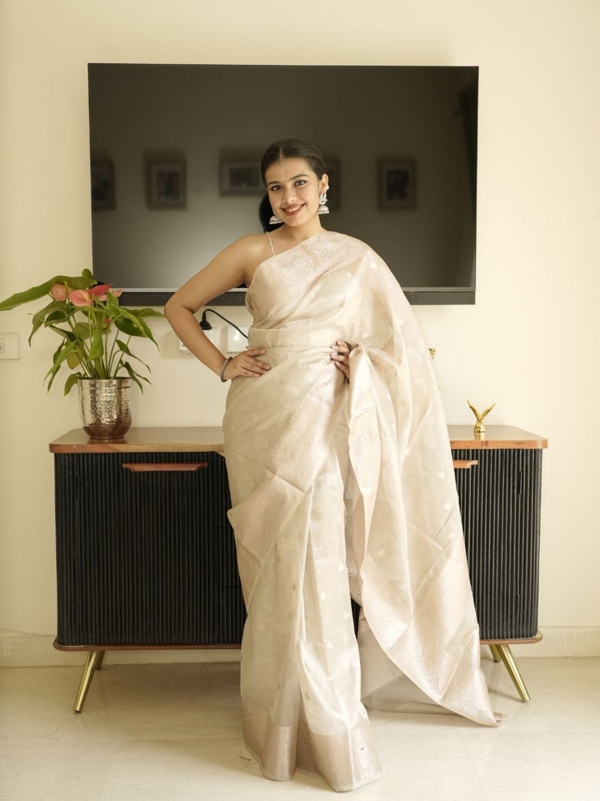 A timeless Banarasi silk saree in ivory, embodying the refined craftsmanship and cultural legacy of this celebrated weaving tradition. This piece showcases the understated elegance characteristic of heritage textiles, perfect for those who appreciate authentic artisanal quality and enduring style.