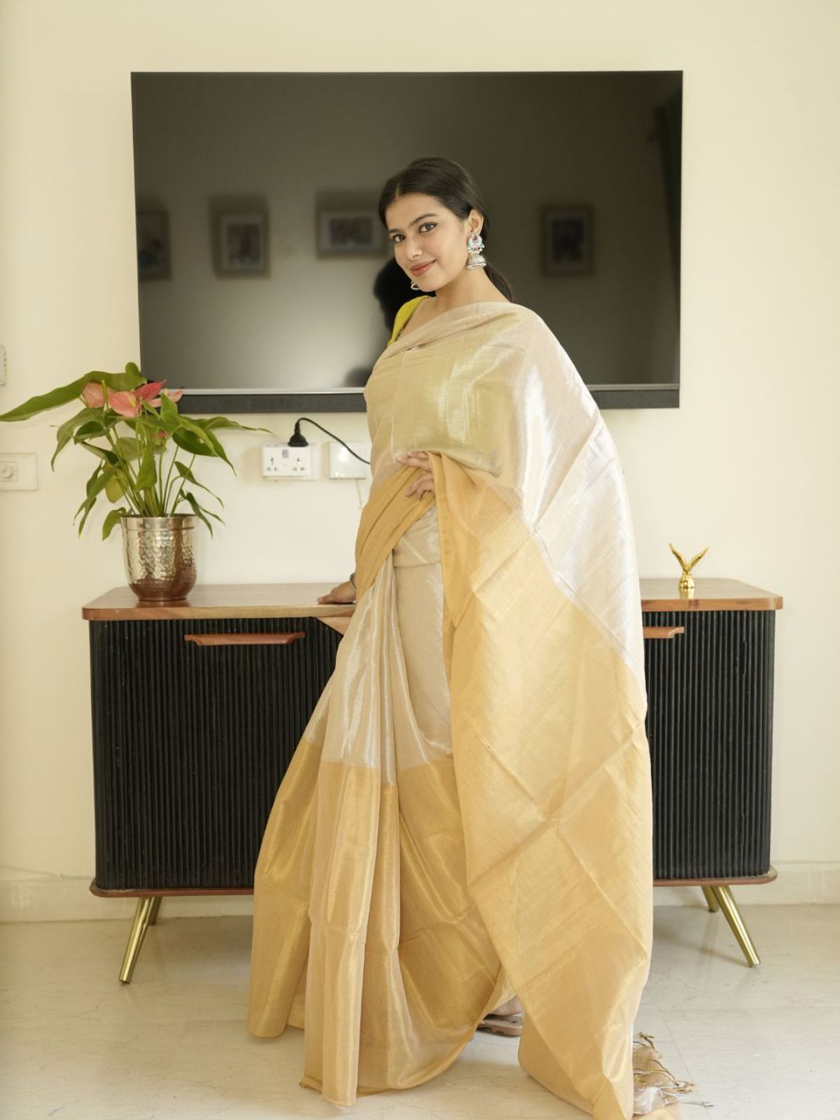Crafted from luxurious glass tissue silk, this ivory saree features luminous gold accents that catch light beautifully. The fabric's delicate drape and subtle sheen create an understated sophistication perfect for formal occasions. Its refined construction ensures comfort without compromising on elegance, making it a versatile addition to any traditional wardrobe.