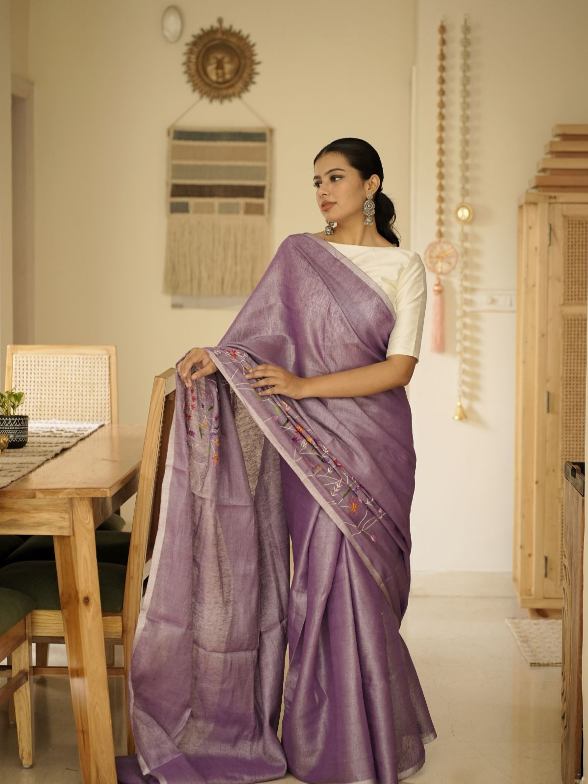 Crafted from premium linen through traditional handweaving techniques, this saree showcases subtle floral embroidery in a sophisticated lavender palette. The result is a garment that balances understated elegance with romantic sensibility, ideal for those who appreciate refined craftsmanship and timeless design.