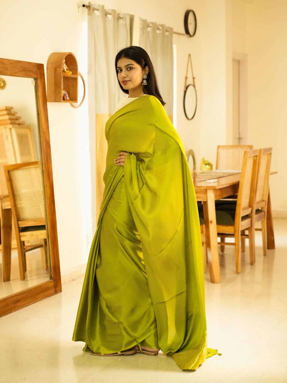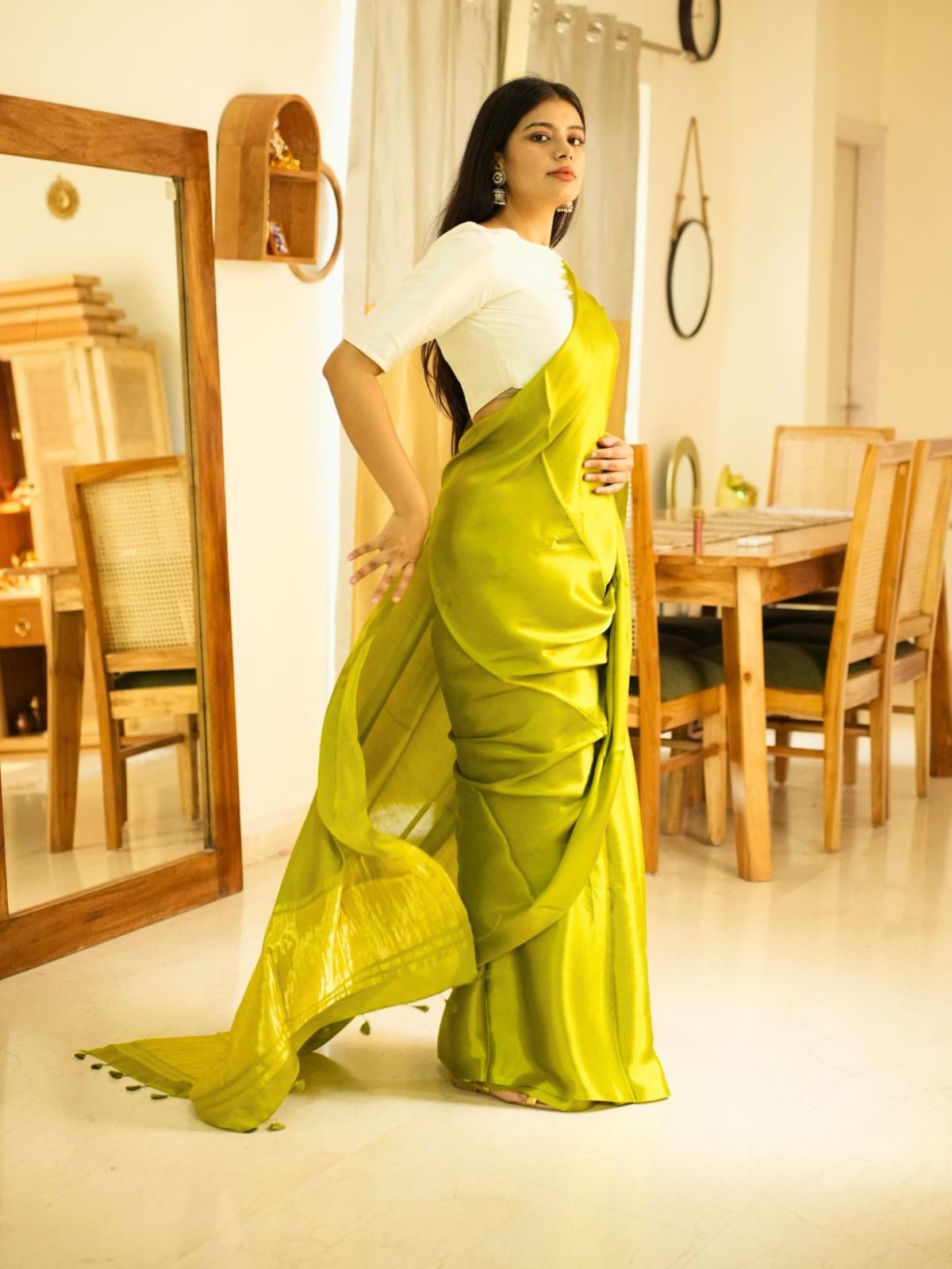 Crafted from premium silk, this saree showcases a striking lime hue complemented by an intricate gold zari border. The combination of luxurious fabric and refined embellishment creates a sophisticated piece suitable for both festive occasions and formal gatherings. The vibrant color palette ensures a distinctive presence while maintaining timeless elegance.
