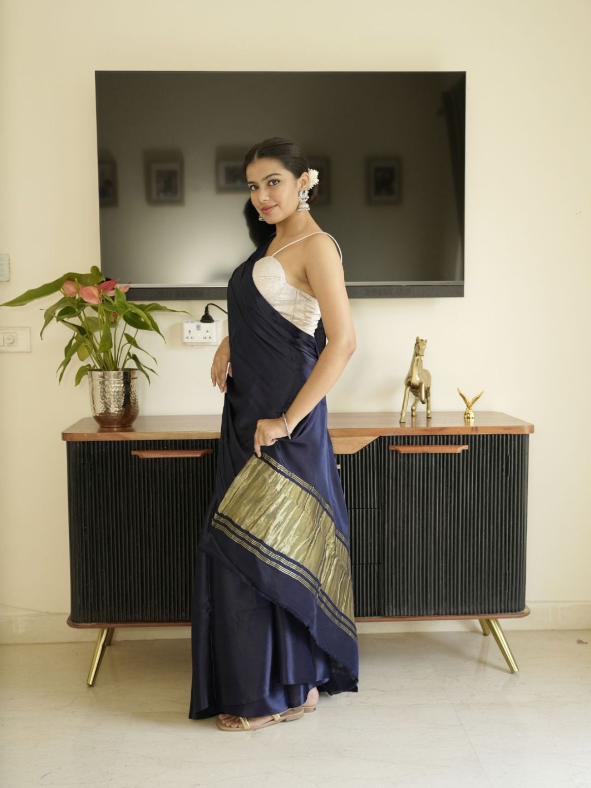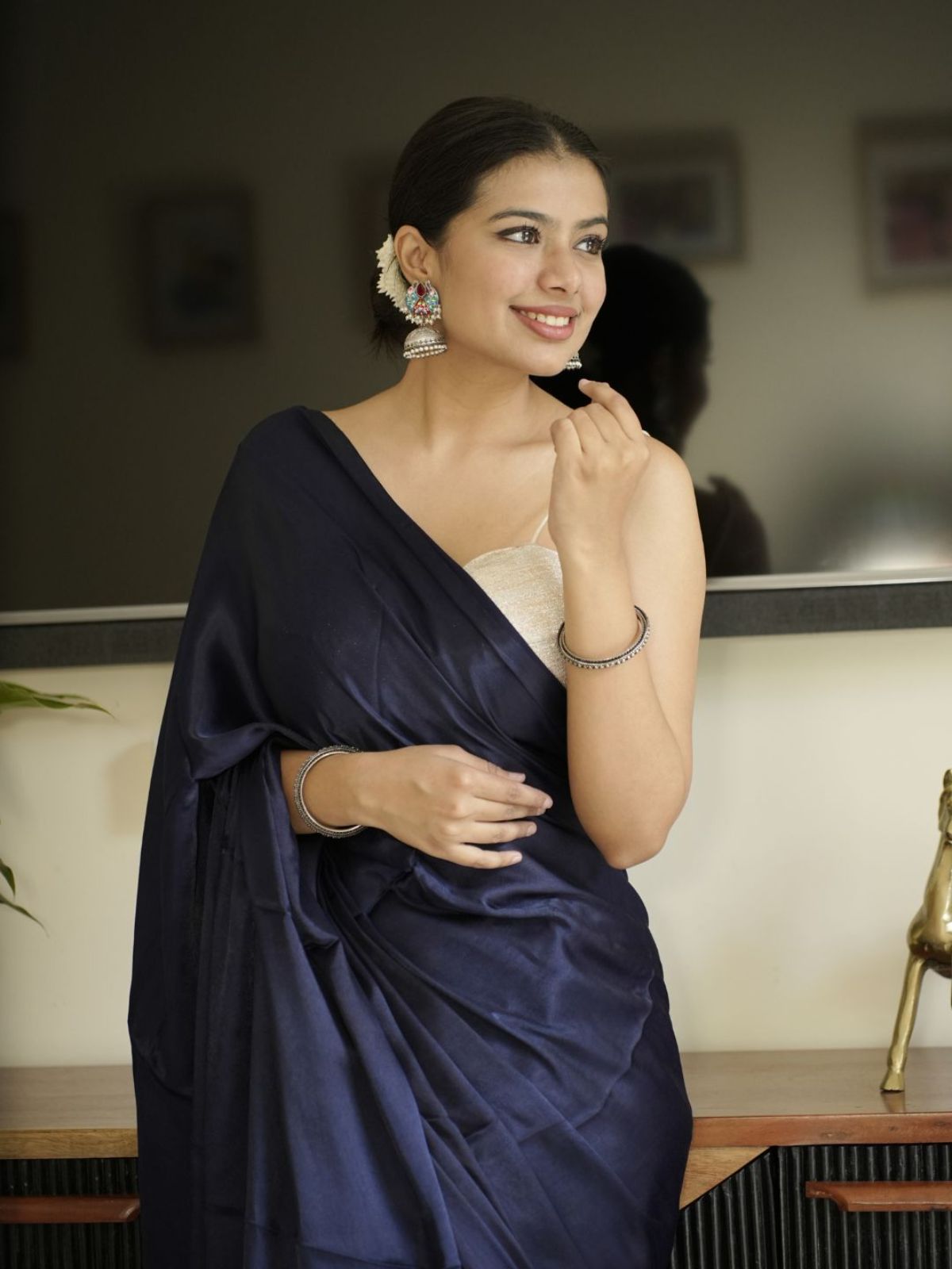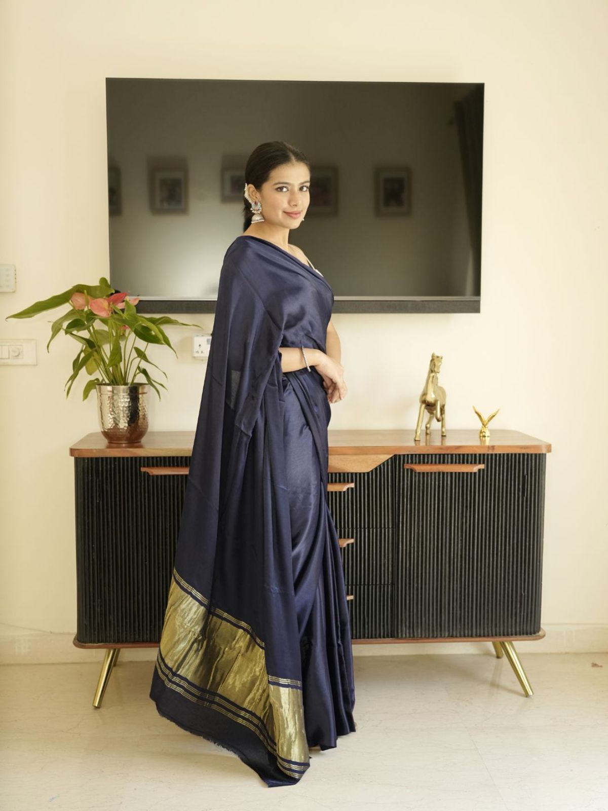 Navy blue modal silk saree offering an elegant sheen and timeless drape. This sophisticated piece combines the luxurious feel of silk with the breathability of modal fabric, creating a garment that moves gracefully with every step. The rich navy hue provides versatility for both traditional occasions and contemporary styling. Perfect for those who appreciate refined craftsmanship and comfort without compromising on elegance.